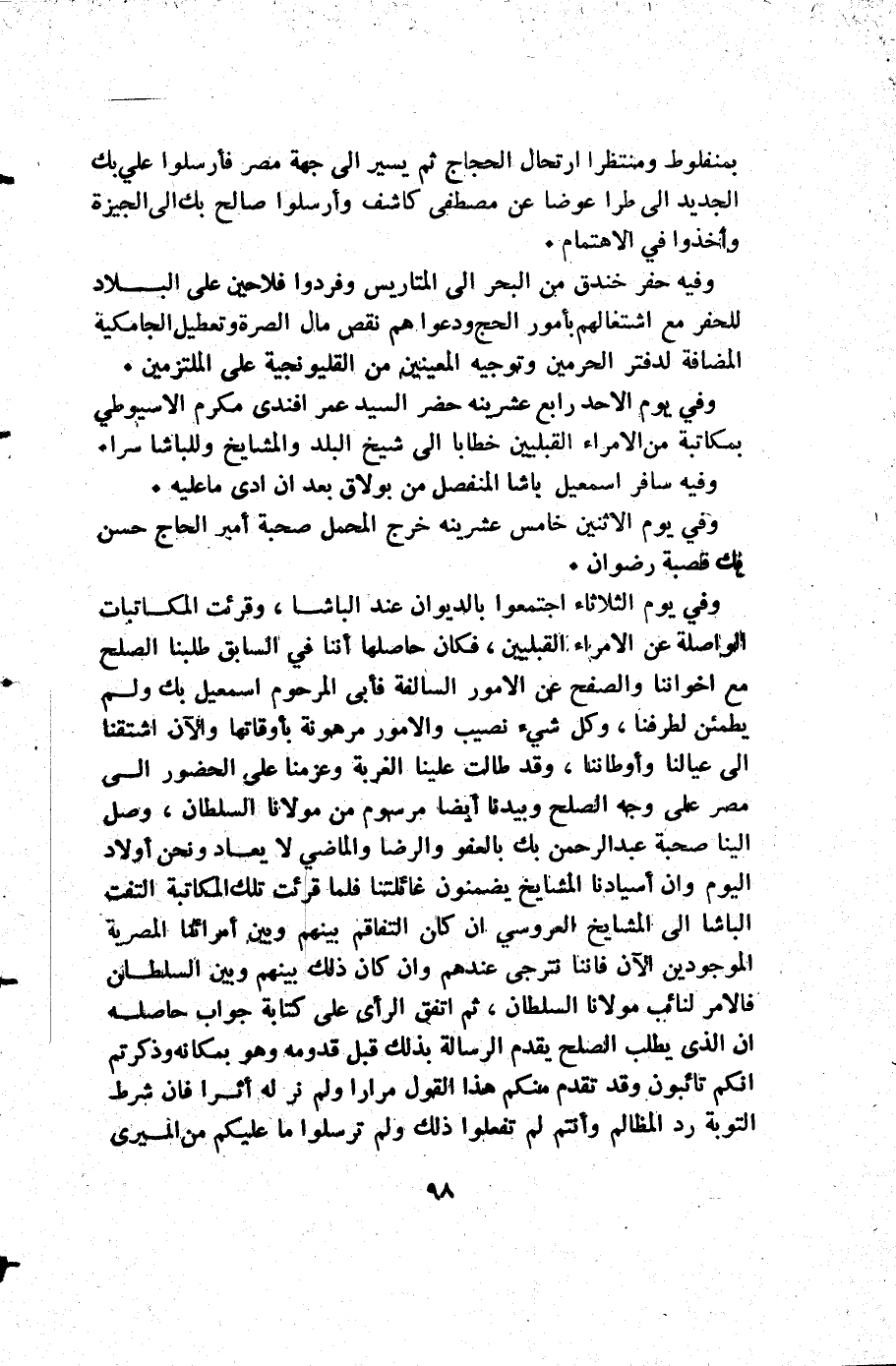 وفي يوم الثلاثاء اجتمعوا بالديوان عند الباشا وقرئت المكاتبات الواصلة عن الأمراء القبليين فكان حاصلها أننا في السابق طلبنا الصلح مع أخواننا والصفح عن الأمور السالفة فأبى المرحوم إسمعيل بك ولم يطمئن لطرفنا وكل شيء نصيب والأمور مرهونة بأوقاتها والآن اشتقنا إلى عيالنا وأوطاننا وقد طالت علينا الغربة وعزمنا على الحضور إلى مصر علىوجه الصلح وبيدنا أيضا مرسوم من مولانا السلطان وصل إلينا صحبة عبد الرحمن بك بالعفو والرضا والماضي لا يعاد ونحن أولاد اليوم وأن أسيادنا المشايخ يضمنون غائلتنا فلما قرئت تلك المكاتبة التفت الباشا إلى المشايخ العروسي أن كان التفاقم بينهم وبين أمرائنا المصرية الموجودين الآن فاننا نترجى عندهم وأن كان ذلك بينهم وبين السلطان فالأمر لنائب مولانا السلطان ثم اتفق الرأي على كتابة جواب حاصله أن الذي يطلب الصلح يقدم الرسالة بذلك قبل قدومه وهو بمكانه وذكرتم أنكم تائبون وقد تقدم منكم هذا القول مرارا ولم نر له أثرا فإن شرط التوبة رد المظالم وأنتم لم تفعلوا ذلك ولم ترسلوا ما عليكم من الميري