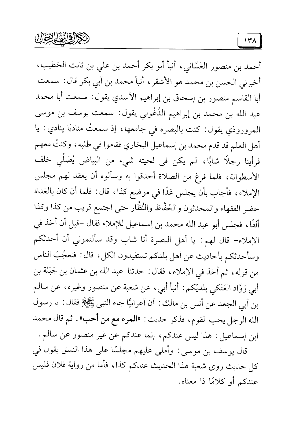 أحمد بن منصور الغَسَّاني، أنبأ أبو بكر أحمد بن عليّ بن ثابت الخطيب، أخبرني الحسن بن محمد هو الأشقر، أنبأ محمد بن أبي بكر قال: سمعت أبا القاسم منصور بن إسحاق بن إبراهيم الأَسْدِي يقول: سمعت أبا محمد عبد الله بن محمد بن إبراهيم الدَّغُولي يقول: سمعت يوسف بن موسي المروروذي يقول: كنت بالبَصْرَة في جامعها، إذ سمعتُ مناديًا ينادي: يا أهل العلم قد قدم محمد بن إسماعيل البُخَاري فقاموا في طلبه، وكنتُ معهم فرأينا رجلًا شابًّا، لم يكن في لحيته شيء من البياض يُصَلِّي خَلَف الأسطوانة، فلما فرغ من الصَّلاة أحدقوا به وسألوه أن يعقد لهم مجلس الإملاء، فأجاب بأن يجلس غدًا في موضع كذا، قال: فلما أن كان بالغداة حضر الفقهاء والمحدثون والحُفَّاظ والنُّظَّار حتَّى اجتمع قريب من كذا وكذا ألفًا، فجلس أبو عبد الله محمد بن إسماعيل للإملاء فقال -قبل أن أخذ في الإملاء- قال لهم: يا أهل البصرة أنا شاب وقد سألتموني أن أحدثكم وسأحدثكم بأحاديث عن أهل بلدكم تستفيدون الكل، قال: فتعجَّبَ النَّاس من قوله، ثمَّ أخذ في الإملاء، فقال: حدَّثنا عبد الله بن عثمان بن جَبَلة بن أبي رَوَّاد العَتَكي بلديّكم: أنبأ أبي، عن شُعْبَة عن منصور وغيره، عن سالم بن أبي الجَعْد عن أنس بن مالك: أن أعرابيًّا جاء النَّبِيّ -صَلَّى اللهُ عَلَيْهِ وَسَلَّمَ- فقال: يا رسول الله الرجل يحب القوم، فذكر حديث: "المرء مع من أحب". ثمَّ قال محمد ابن إسماعيل: هذا ليس عندكم، إنَّما عندكم عن غير منصور عن سالم.