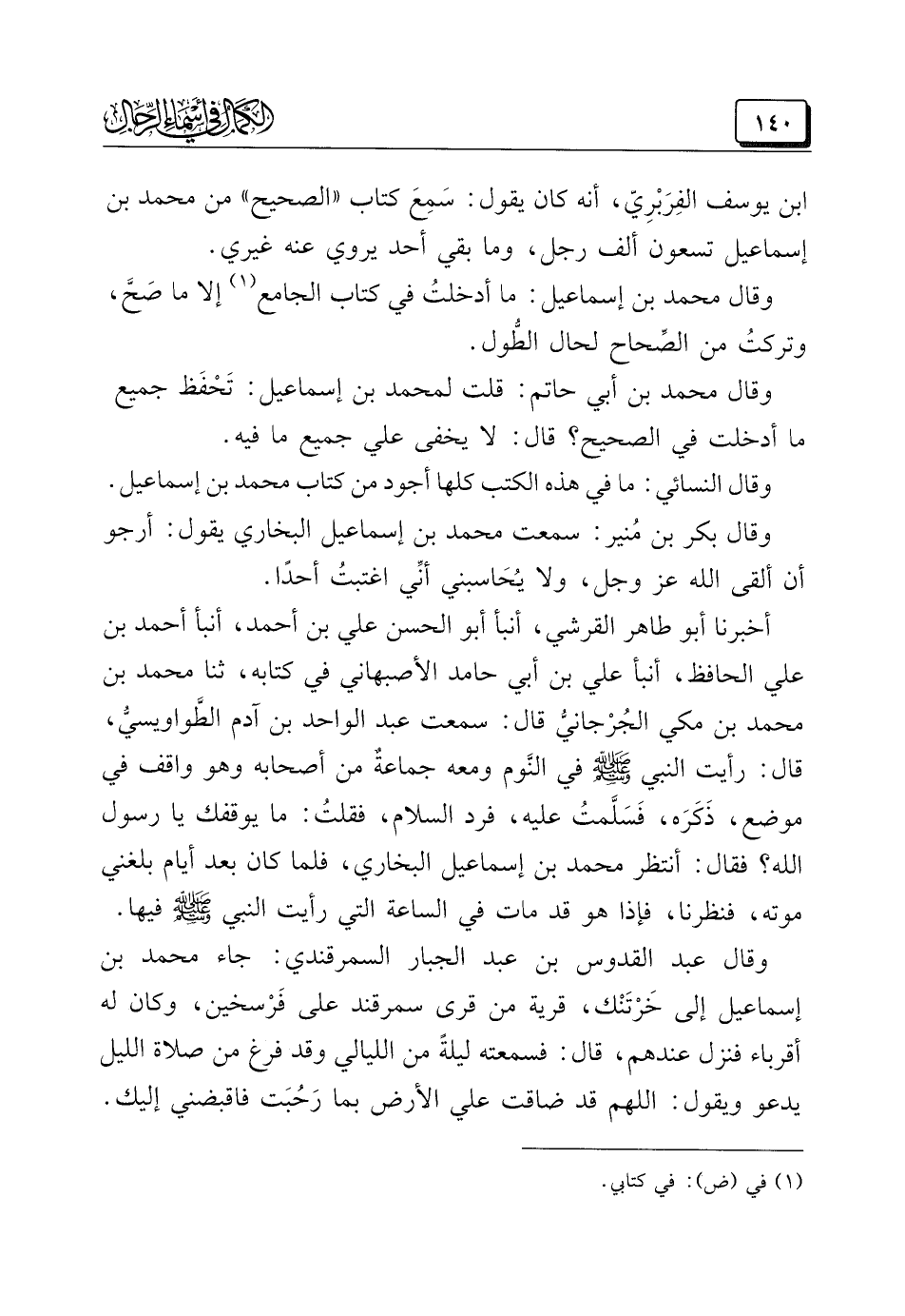 ابن يوسف الفِرَبْرِيّ، أنَّه كان يقول: سَمِعَ كتاب "الصحيح" من محمد بن إسماعيل تسعون ألف رجل، وما بقي أحد يروى عنه غيري.