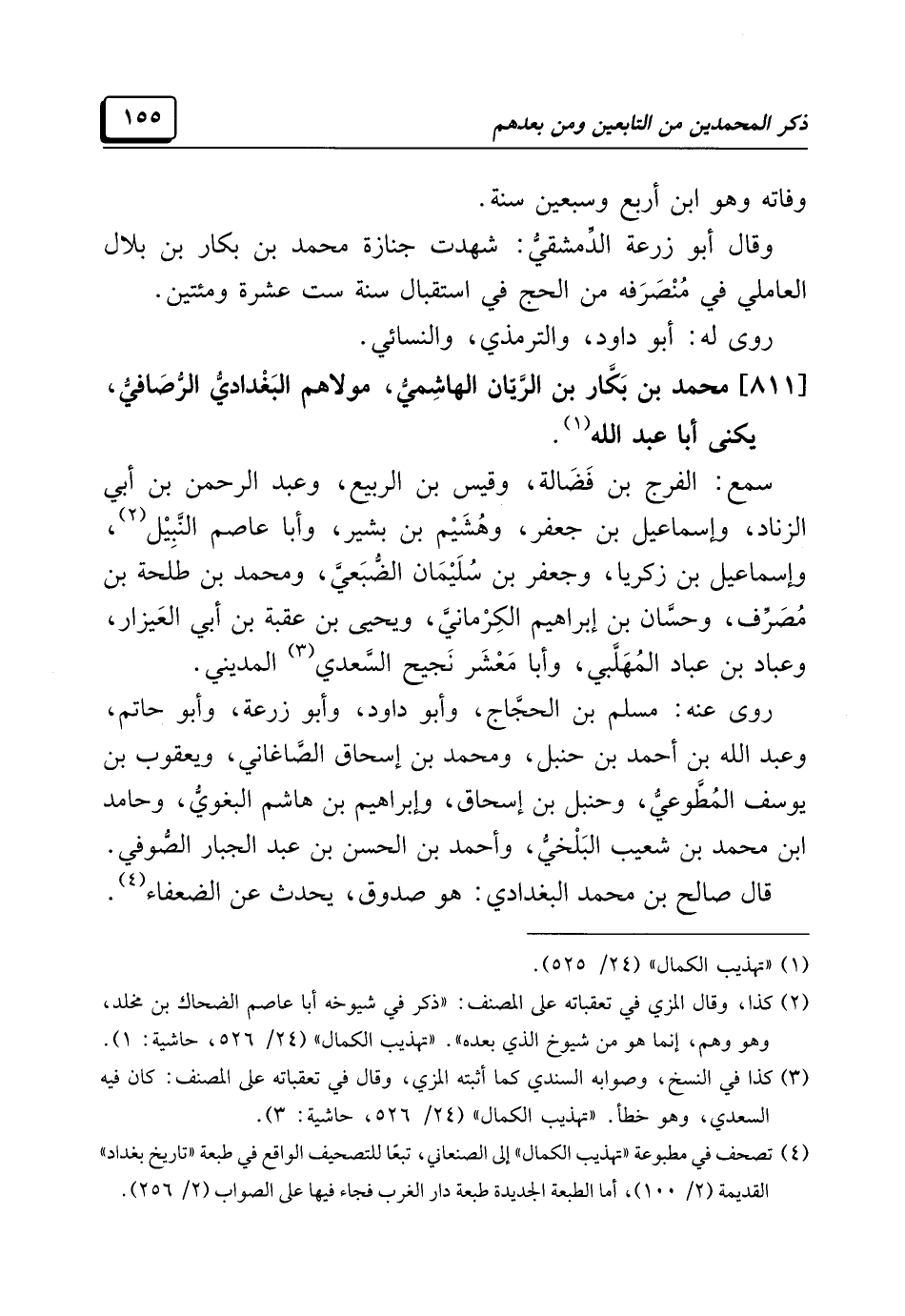 [٨١١] محمد بن بَكَّار بن الرَّيَّان الهاشِميُّ، مولاهم البَغْدَادِيُّ الرُّصَافيُّ، يُكْنَى أبا عبد الله (¬١).