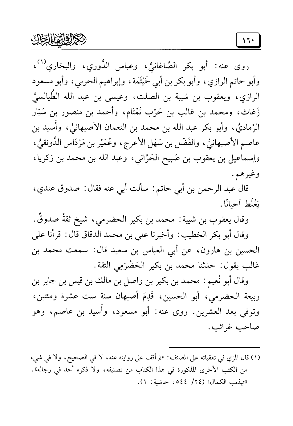 وقال أبو نُعَيْم: محمد بن بكير بن واصل بن مالك بن قيس بن جابر بن رَبِيعَةَ الحَضْرَمِي، أبو الحسين، قَدِمَ أَصْبَهَان سنة ست عشرة ومئتين، وتوفي بعد العشرين. روى عنه: أبو مسعود، وأَسيد بن عاصم، وهو صاحب غرائب.