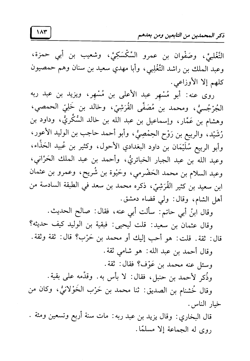 التَّغْلبيَّ، وصَفْوان بن عمرو السَّكْسَكِيَّ، وشعيب بن أبي حمزة، وعبد الملك بن راشد التَّغْلِبي، وأبا مهدي سعيد بن سنان وهم حمصيون كلهم إلا الأوزاعي.