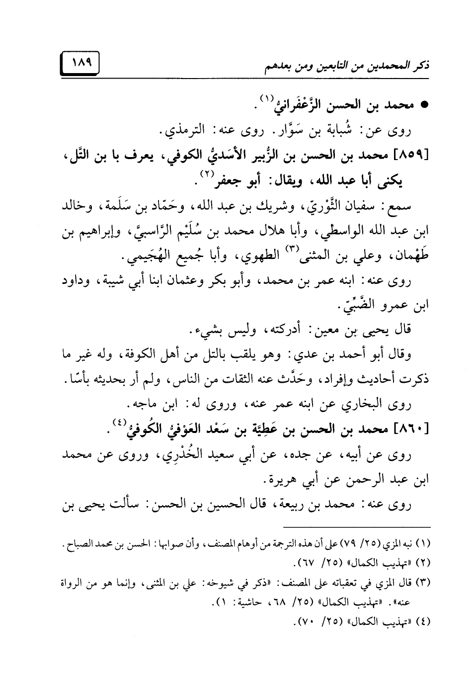 [٨٥٩] محمد بن الحسن بن الزُّبير الأسَديُّ الكوفي، يعرف بابن التَّل، يكنى أبا عبد الله، ويقال: أبو جعفر (¬٢).