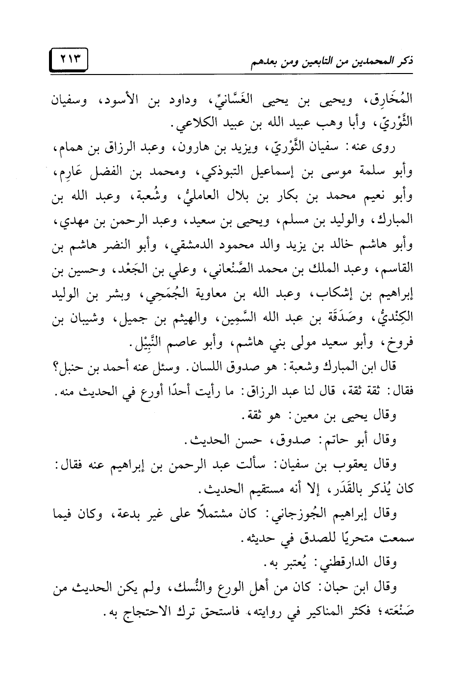 قال ابن المبارك وشعبة: هو صدوق اللسان. وسئل عنه أحمد بن حَنْبَل؟ فقال: ثقة ثقة، قال لنا عبد الرَّزَّاق: ما رأيت أحدًا أورع في الحديث منه.