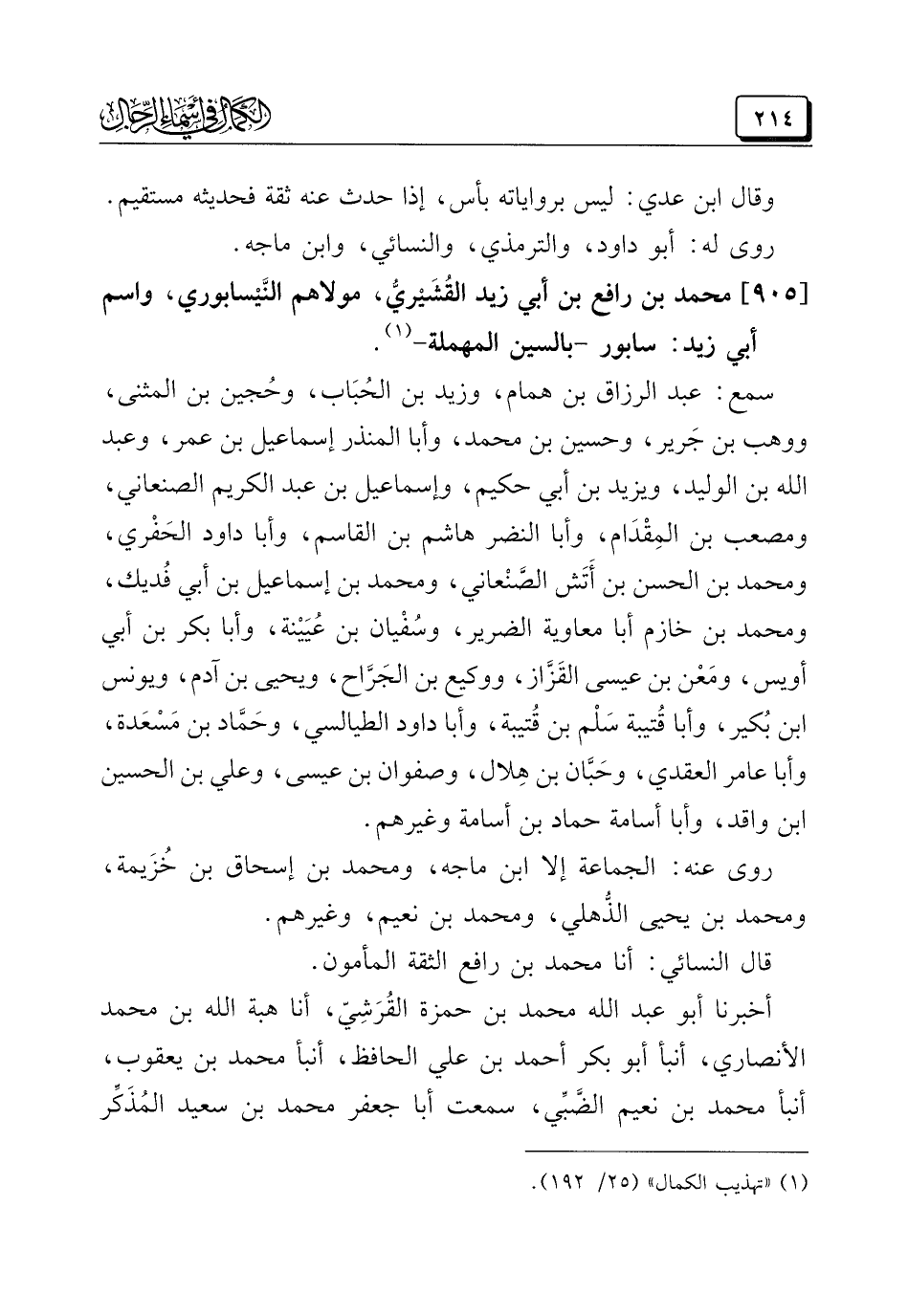[٩٠٥] محمد بن رافع بن أبي زيد القُشَيْرِيُّ، مولاهم النَّيْسَابُورِيّ، واسم أبي زيد: سابور -بالسين المهملة- (¬١).