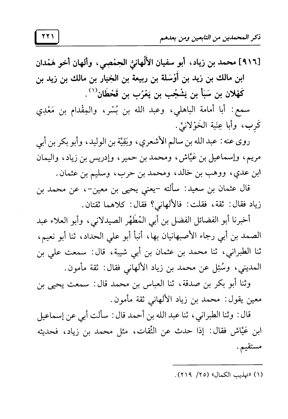 [٩١٦] محمد بن زياد، أبو سفيان الأَلْهَانِيُّ الحِمْصِي، وألهان أخو هَمْدان ابن مالك بن زيد بن أَوْسَلة بن رَبِيعَة بن الخِيَار بن مالك بن زيد بن كَهْلان بن سَبَأ بن يَشْجُب بن يَعْرُب بن قَحْطَان (¬١).