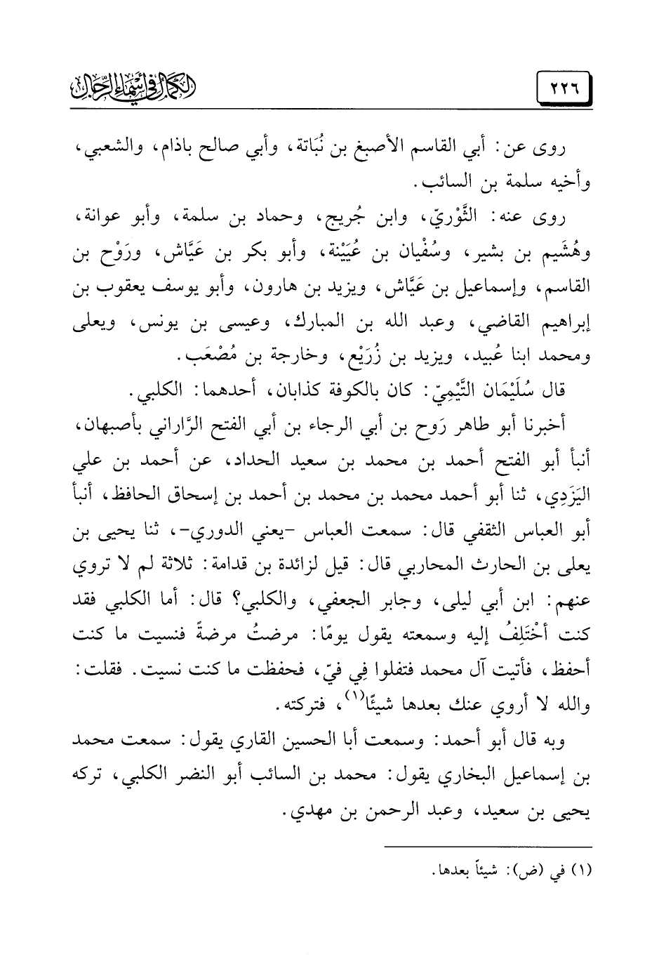 وبه قال أبو أحمد: وسمعت أبا الحسين القاري يقول: سمعت محمد بن إسماعيل البُخَاري يقول: محمد بن السَّائِب أبو النَّضْر الكلبي، تركهـ يحيى بن سعيد، وعبد الرحمن بن مهدي.