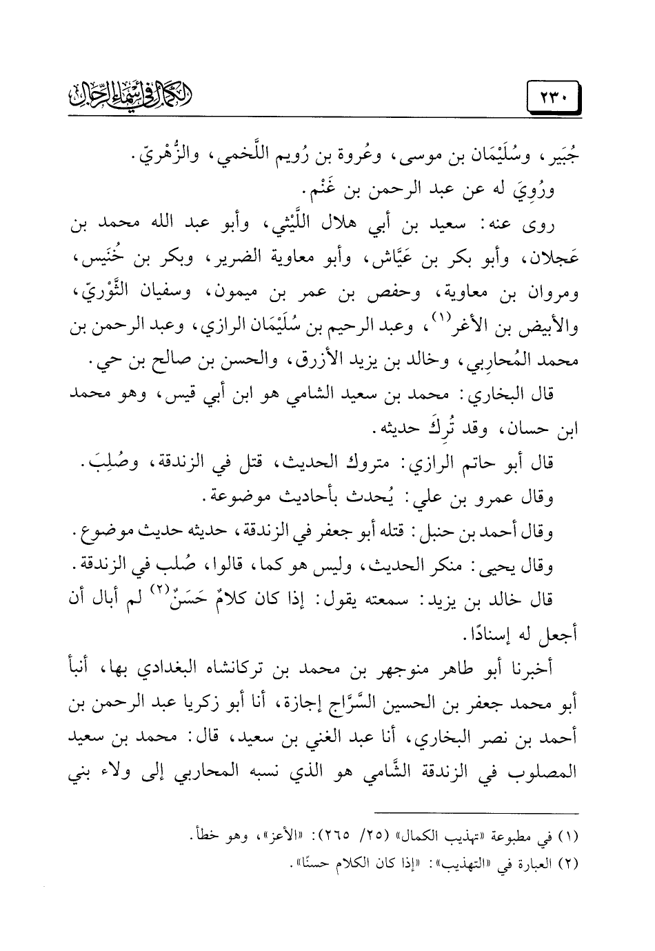 أخبرنا أبو طاهر منوجهر بن محمد بن تركانشاه البَغْدَادِيّ بها، أنبأ أبو محمد جعفر بن الحسين السَّرَّاج إجازة، أنا أبو زكريا عبد الرحمن بن أحمد بن نصر البُخَاري، أنا عبد الغني بن سعيد، قال: محمد بن سعيد المصلوب في الزندقة الشَّامِيّ هو الَّذي نسبة المُحَارِبي إلى ولاء بني