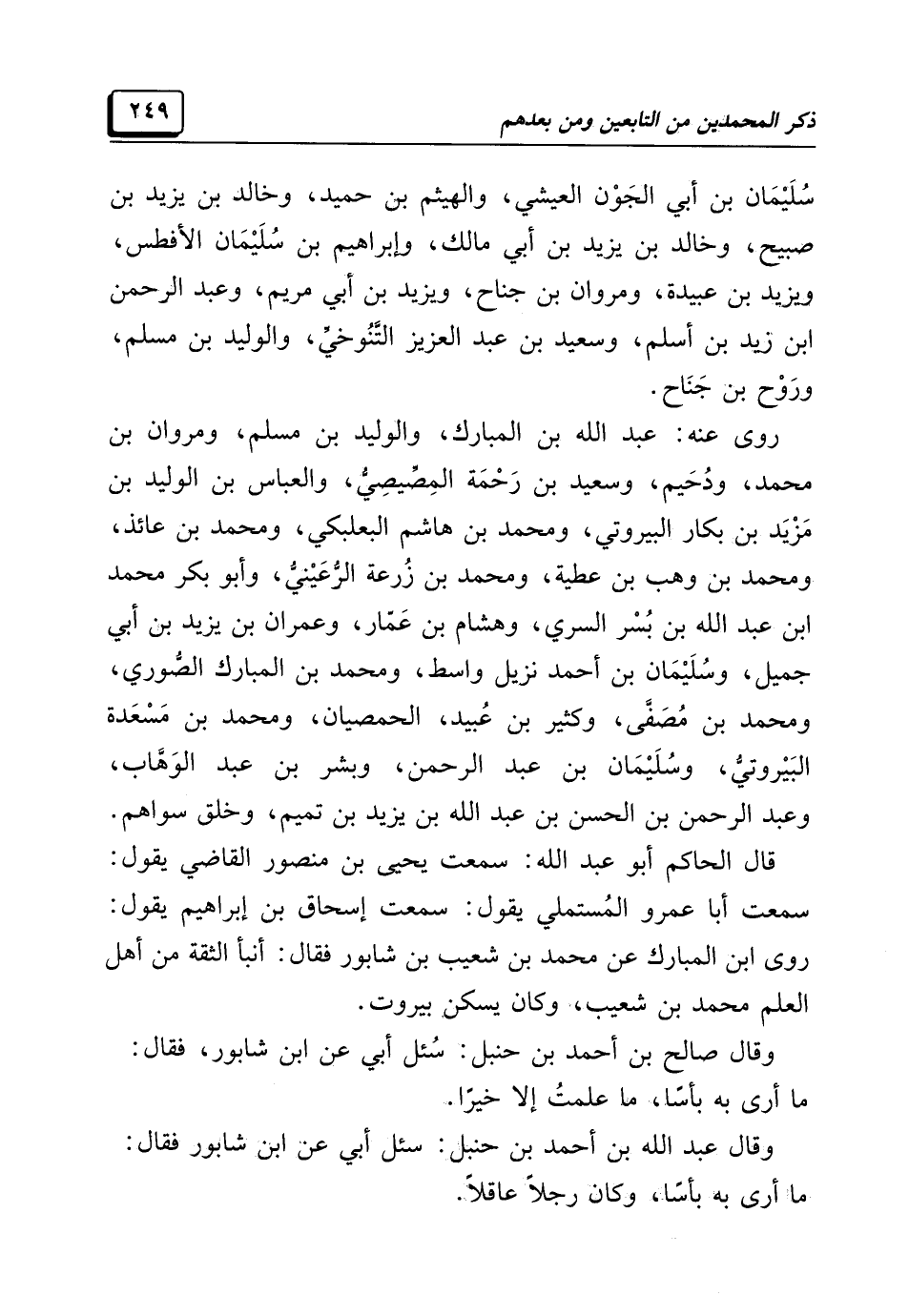قال الحاكم أبو عبد الله: سمعت يحيى بن منصور القاضي يقول: سمعت أبا عمرو المُسْتَمْلِي يقول: سمعت إسحاق بن إبراهيم يقول: روي ابن المُبَارَك عن محمد بن شُعَيْب بن شابور فقال: أنبأ الثقة من أهل العلم محمد بن شُعَيْب، وكان يسكن بيروت.