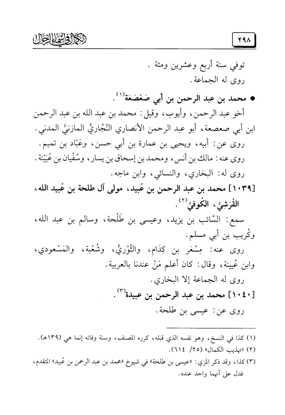 [١٠٣٩] محمد بن عبد الرحمن بن عُبيد، مولى آل طلحة بن عُبيد الله، القُرَشِيُّ، الكُوفيُّ (¬٢).