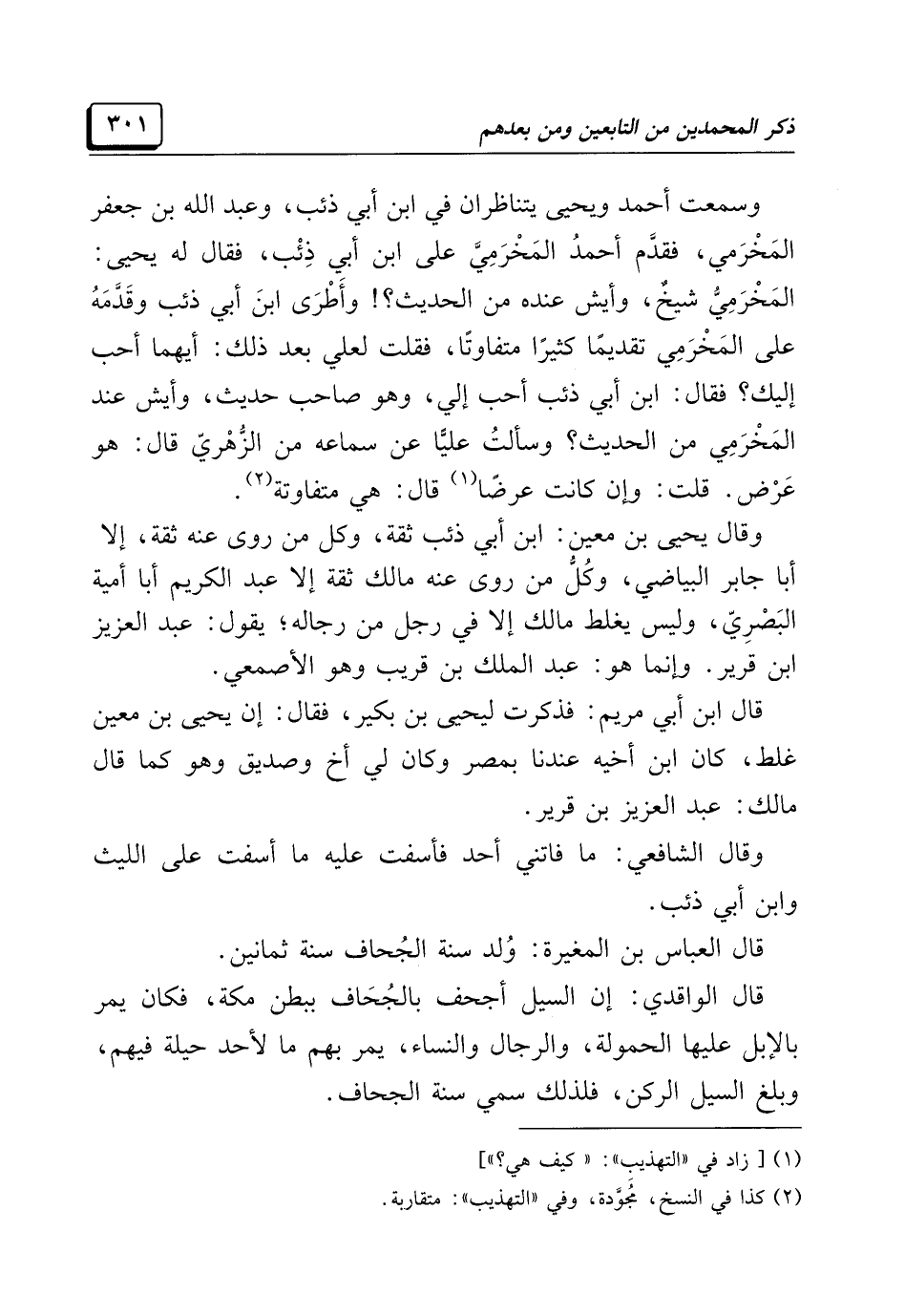 وسمعت أحمد ويحيى يتناظران في ابن أبي ذئب، وعبد الله بن جعفر المَخْرَمي، فقدَّم أحمدُ المَخْرَمِيَّ على ابن أبي ذِئْب، فقال له يحيى: المَخْرَمِيُّ شيخٌ، وأيش عنده من الحديث؟ ! وأَطْرَى ابن أبي ذئب وقَدَّمَهُ على المَخْرَمِي تقديمًا كثيرًا متفاوتًا، فقلت لعلي بعد ذلك: أيهما أحب إليك؟ فقال: ابن أبي ذئب أحب إلي، وهو صاحب حديث، وأيش عند المَخْرَمِي من الحديث؟ وسألتُ عليًّا عن سماعه من الزُّهْريّ قال: هو عَرْض. قلت: وإن كانت عرضًا (¬١) قال: هي متفاوتة (¬٢).