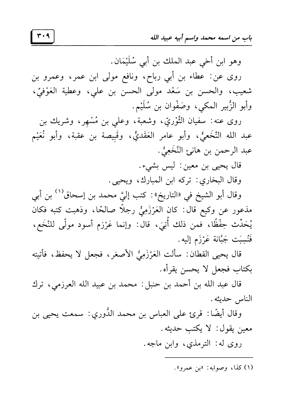 قال عبد الله بن أحمد بن حنبل: محمد بن عبيد الله العرزمي، ترك الناس حديثه.