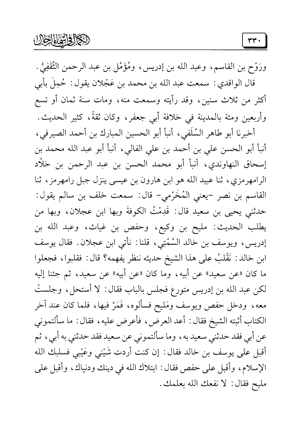 أخبرنا أبو طاهر السِّلَفي، أنبأ أبو الحسين المبارك بن أحمد الصيرفي، أنبأ أبو الحسن علي بن أحمد بن علي الفالي، أنبأ أبو عبد الله محمد بن إسحاق النهاوندي، أنبأ أبو محمد الحسن بن عبد الرحمن بن خلَّاد الرامهرمزي، ثنا عبيد الله هو ابن هارون بن عيسى ينزل جبل رامهرمز، ثنا القاسم بن نصر -يعني المُخَرِّمي- قال: سمعت خلف بن سالم يقول: حدثني يحيى بن سعيد قال: قَدِمْتُ الكوفةَ وبها ابن عجلان، وبها من يطلب الحديث: مليح بن وكيع، وحفص بن غياث، وعبد الله بن إدريس، ويوسف بن خالد السَّمْتِي، قلنا: نأتي ابن عجلان. فقال يوسف ابن خالد: نَقْلبُ على هذا الشيخ حديثه ننظر يفهمه؟ قال: فقلبوا، فجعلوا ما كان "عن سعيد" عن أبيه، وما كان "عن أبيه" عن سعيد، ثم جئنا إليه لكن عبد الله بن إدريس متورع فجلس بالباب فقال: لا أستحل، وجلستُ معه، ودخل حفص ويوسف ومَليح فسألوه، فَمَرَّ فيها، فلما كان عند آخر الكتاب أثبته الشيخ فقال: أعد العرض، فأعرض عليه، فقال: ما سألتموني عن أبي فقد حدثني سعيد به، وما سألتموني عن سعيد فقد حدثني به أبي، ثم أقبل على يوسف بن خالد فقال: إن كنت أردت شَيْني وعَيْبي فسلبك الله الإسلام، وأقبل على حفص فقال: ابتلاك الله في دينك ودنياك، وأقبل على مليح فقال: لا نفعك الله بعلمك.