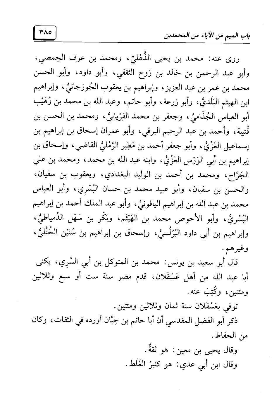 ذكر أبو الفضل المقدسي أن أبا حاتم بن حِبَّان أورده في الثقات، وكان من الحفاظ.