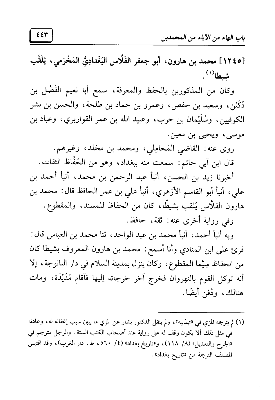 [١٢٤٥] محمد بن هارون، أبو جعفر الفَلَّاس البَغْدادِيُّ المَخْرَمي، يُلَقَّب شِيطا (¬١).