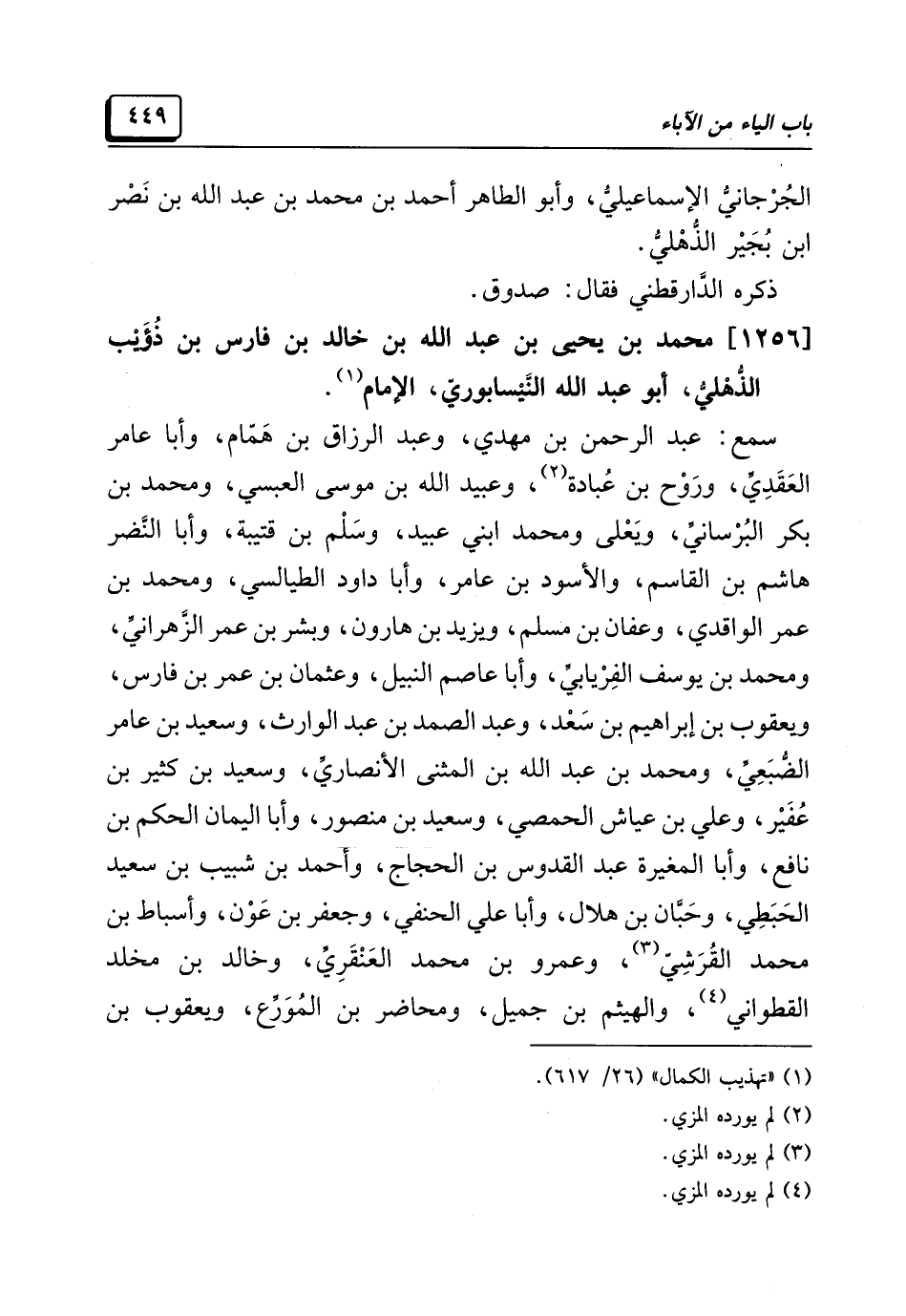 [١٢٥٦] محمد بن يحيى بن عبد الله بن خالد بن فارس بن ذُؤَيْب الذُّهْليُّ، أبو عبد الله النَّيْسابوريُّ، الإمام (¬١).