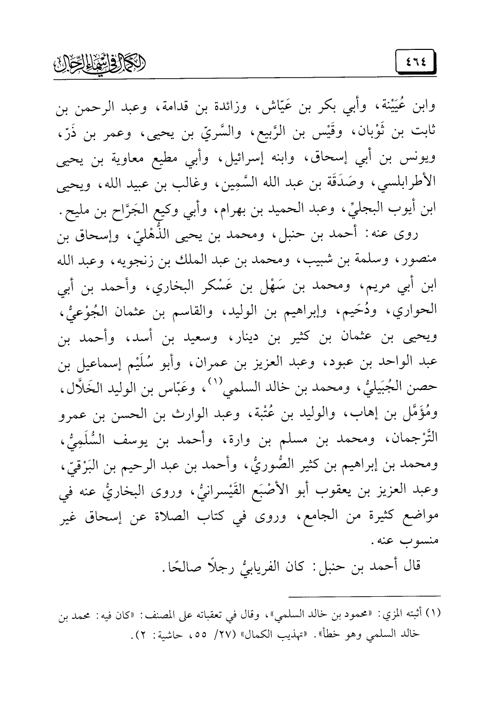 قال أحمد بن حنبل: كان الفريابيُّ رجلًا صالحًا.