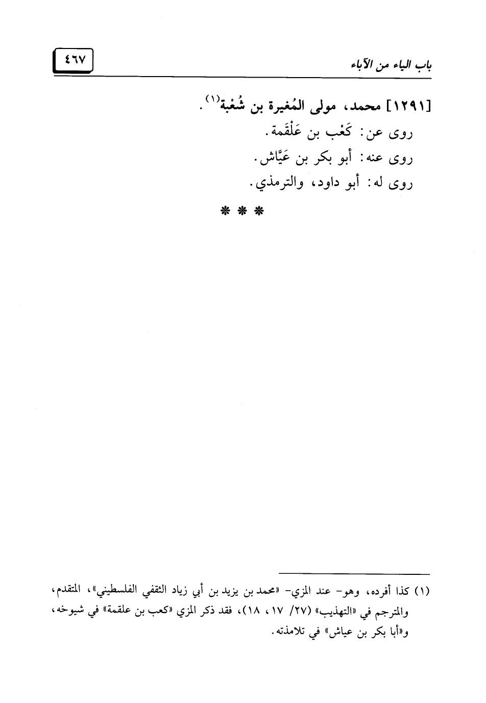 (¬١) كذا أفرده، وهو -عند المزي- "محمد بن يزيد بن أبي زياد الثقفي الفلسطيني"، المتقدم، والمترجم في "التهذيب" (٢٧/ ١٧، ١٨)، فقد ذكر المزي "كعب بن عَلْقَمة" في شيوخه، و"أبا بكر بن عياش" في تلامذته.