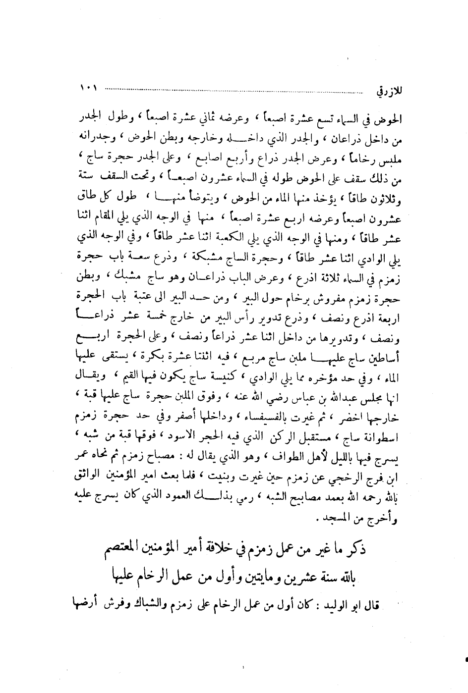 §ذِكْرُ مَا غُيِّرَ مِنْ عَمَلِ زَمْزَمَ فِي خِلَافَةِ أَمِيرِ الْمُؤْمِنِينَ الْمُعْتَصِمِ بِاللَّهِ سَنَةَ عِشْرِينَ وَمِائَتَيْنِ، وَأَوَّلِ مَنْ عَمِلَ الرُّخَامَ عَلَيْهَا قَالَ أَبُو الْوَلِيدِ: كَانَ أَوَّلَ مَنْ عَمِلَ الرُّخَامَ عَلَى زَمْزَمَ وَالشُّبَّاكَ، وَفَرَشَ أَرْضَهَا