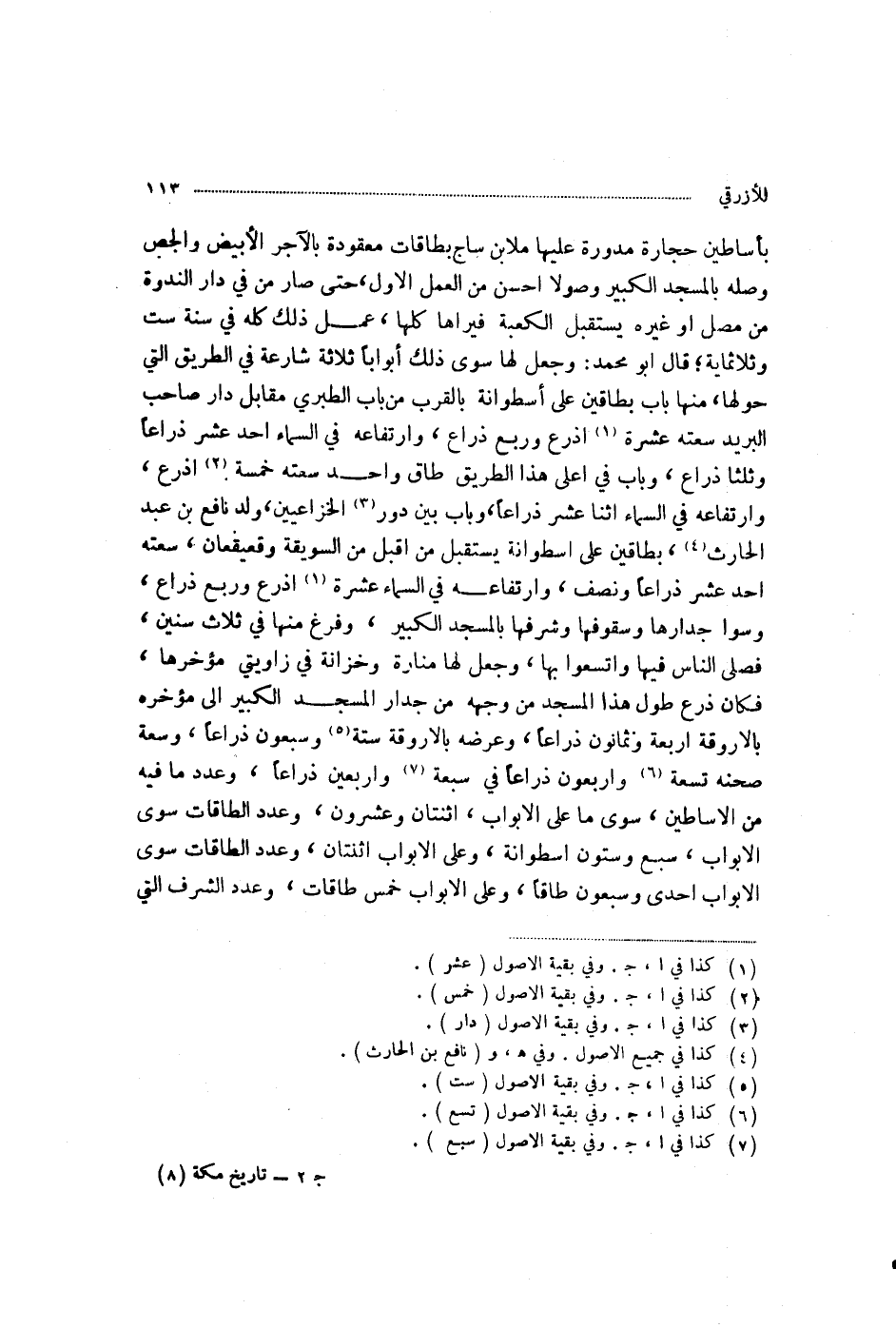 بِأَسَاطِينَ حِجَارَةٍ مُدَوَّرَةٍ عَلَيْهَا مَلَابِنُ سَاجٍ بِطَاقَاتٍ مَعْقُودَةٍ بِالْآجُرِّ الْأَبْيَضِ وَالْجِصِّ، وَصَلَهُ بِالْمَسْجِدِ الْكَبِيرِ وُصُولًا أَحْسَنَ مِنَ الْعَمَلِ الْأَوَّلِ، حَتَّى صَارَ مَنْ فِي دَارِ النَّدْوَةِ مِنْ مُصَلٍّ أَوْ غَيْرِهِ يَسْتَقْبِلُ الْكَعْبَةَ فَيَرَاهَا كُلَّهَا عَمِلَ ذَلِكَ كُلَّهُ فِي سَنَةِ سِتٍّ وَثَلَاثِمِائَةٍ قَالَ أَبُو مُحَمَّدٍ: " وَجَعَلَ لَهَا سِوَى ذَلِكَ أَبْوَابًا ثَلَاثَةً شَارِعَةً فِي الطَّرِيقِ الَّتِي حَوْلَهَا، مِنْهَا بَابٌ بِطَاقَيْنِ عَلَى أُسْطُوَانَةٍ بِالْقُرْبِ مِنْ بَابِ الطَّبَرِيِّ مُقَابِلَ دَارِ صَاحِبِ الْبَرِيدِ سَعَتُهُ عَشَرَةُ أَذْرُعٍ وَرُبُعُ ذِرَاعٍ، وَارْتِفَاعُهُ فِي السَّمَاءِ أَحَدَ عَشَرَ ذِرَاعًا وَثُلُثَا ذِرَاعٍ، وَبَابٌ فِي أَعْلَى هَذَا الطَّرِيقِ طَاقٌ وَاحِدٌ سَعَتُهُ خَمْسَةُ أَذْرُعٍ، وَارْتِفَاعُهُ فِي السَّمَاءِ اثْنَا عَشَرَ ذِرَاعًا، وَبَابٌ بَيْنَ دُورِ الْخُزَاعِيِّينَ وَلَدِ نَافِعِ بْنِ عَبْدِ الْحَارِثِ بِطَاقَيْنِ عَلَى أُسْطُوَانَةٍ يَسْتَقْبِلُ مَنْ أَقْبَلَ مِنَ السُّوَيْقَةِ وَقُعَيْقِعَانِ، سَعَتُهُ أَحَدَ عَشَرَ ذِرَاعًا وَنِصْفٌ، وَارْتِفَاعُهُ فِي السَّمَاءِ عَشَرَةُ أَذْرُعٍ وَرُبُعُ ذِرَاعٍ، وَسَوَّى جِدَارَهَا وَسُقُوفَهَا وَشُرَفَهَا بِالْمَسْجِدِ الْكَبِيرِ، وَفَرَغَ مِنْهَا فِي ثَلَاثِ سِنِينَ، فَصَلَّى النَّاسُ فِيهَا وَاتَّسَعُوا بِهَا، وَجَعَلَ مَنَارَةً وَخِزَانَةً فِي زَاوِيَتَيْ مُؤَخَّرِهَا، فَكَانَ ذَرْعُ طُولِ هَذَا الْمَسْجِدِ مِنْ وَجْهِهِ مِنْ جِدَارِ الْمَسْجِدِ الْكَبِيرِ إِلَى مُؤَخَّرِهِ بِالْأَرْوِقَةِ أَرْبَعَةٌ وَثَمَانُونَ ذِرَاعًا، وَعَرْضُهُ بِالْأَرْوِقَةِ سِتَّةٌ وَسَبْعُونَ ذِرَاعًا، وَسَعَةُ صَحْنِهِ تِسْعَةٌ وَأَرْبَعُونَ ذِرَاعًا فِي سَبْعَةٍ وَأَرْبَعِينَ ذِرَاعًا، وَعَدَدُ مَا فِيهِ مِنَ الْأَسَاطِينِ سِوَى مَا عَلَى الْأَبْوَابِ اثْنَتَانِ وَعِشْرُونَ، وَعَدَدُ الطَّاقَاتِ سِوَى الْأَبْوَابِ سَبْعٌ وَسِتُّونَ أُسْطُوَانَةً، عَلَى الْأَبْوَابِ اثْنَتَانِ، وَعَدَدُ الطَّاقَاتِ سِوَى الْأَبْوَابِ إِحْدَى وَسَبْعُونَ طَاقًا، وَعَلَى الْأَبْوَابِ خَمْسُ طَاقَاتٍ، وَعَدَدُ الشُّرَفِ الَّتِي