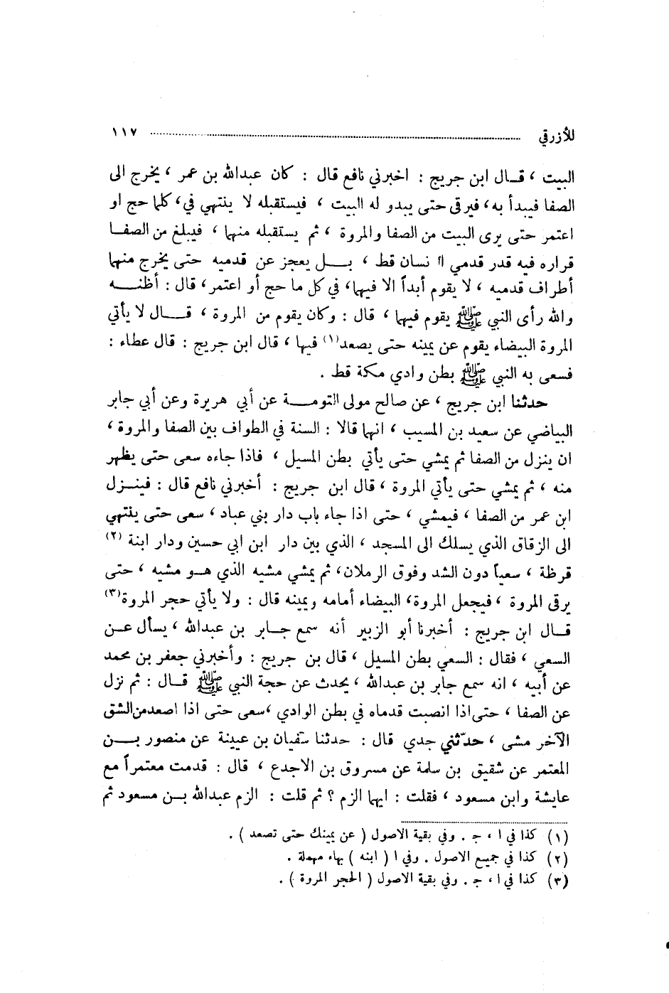 حَدَّثَنَا أَبُو الْوَلِيدِ قَالَ: حَدَّثَنِي جَدِّي، عَنِ الزَّنْجِيِّ، عَنِ ابْنِ جُرَيْجٍ، قَالَ: قَالَ عَطَاءٌ: " §فَخَرَجَ النَّبِيُّ صَلَّى اللهُ عَلَيْهِ وَسَلَّمَ مِنْ بَابِ بَنِي مَخْزُومٍ إِلَى الصَّفَا قَالَ: فَبَلَغَنِي أَنَّ النَّبِيَّ صَلَّى اللهُ عَلَيْهِ وَسَلَّمَ كَانَ يُسْنِدُ فِيهِمَا قَلِيلًا فِي الصَّفَا وَالْمَرْوَةِ غَيْرَ كَثِيرٍ، فَيَرَى مِنْ ذَلِكَ الْبَيْتَ " قَالَ: وَلَمْ يَكُنْ حِينَئِذٍ هَذَا الْبُنْيَانُ قُلْتُ لَهُ: أَوَصَفَ ذَلِكَ لَكَ، وَسَمَّى حَيْثُ كَانَ يَبْلُغُ ذَلِكَ؟ قَالَ: لَا، إِلَّا كَذَلِكَ، كَانَ يُسْنِدُ فِيهِمَا قَلِيلًا كَيْفَ تَرَى الْآنَ قَالَ: «كَذَلِكَ أَسْنَدَ فِيهِمَا» قُلْتُ: أَفَلَا أُسْنِدَ حَتَّى أَرَى الْبَيْتَ؟ قَالَ: لَا، ثُمَّ إِلَّا أَنْ تَشَاءَ غَيْرَ مَرَّةٍ قَالَ: ذَلِكَ لِي، فَأَمَّا أَنْ يَكُونَ حَقًّا عَلَيْكَ فَلَا , وَلَمْ يُخْبِرْنِي أَنَّ النَّبِيَّ صَلَّى اللهُ عَلَيْهِ وَسَلَّمَ كَانَ يَبْلُغُ الْمَرْوَةَ الْبَيْضَاءَ , قَالَ: كَانَ يُسْنِدُ فِيهِمَا قَلِيلًا، وَلَا يَبْلُغُ ذَلِكَ