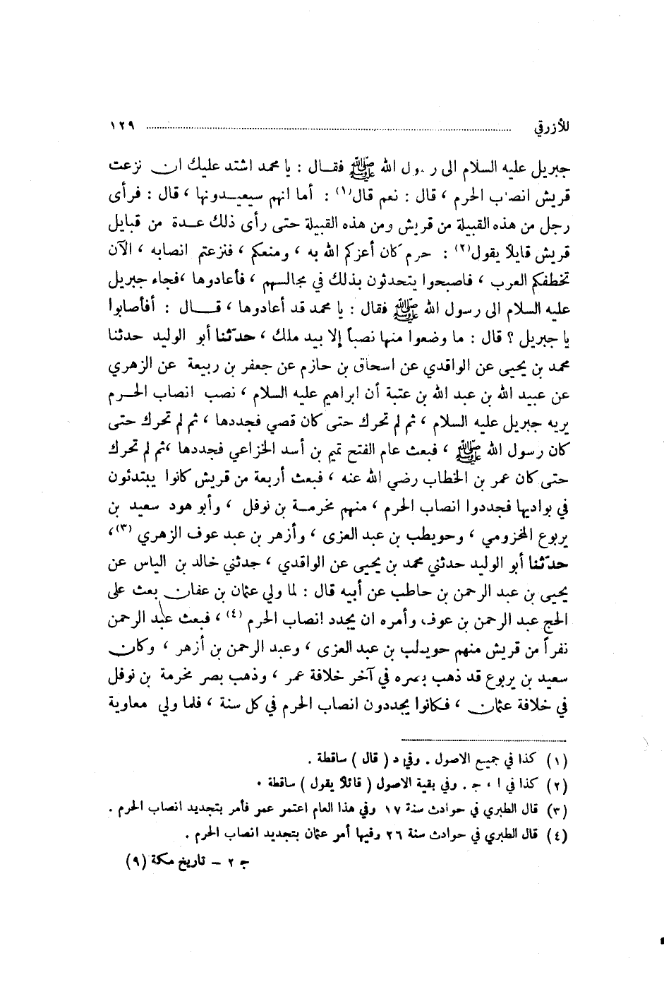 حَدَّثَنَا مُحَمَّدُ بْنُ يَحْيَى، عَنِ الْوَاقِدِيِّ، عَنْ إِسْحَاقَ بْنِ حَازِمٍ، عَنْ جَعْفَرِ بْنِ رَبِيعَةَ، عَنِ الزُّهْرِيِّ، عَنْ عُبَيْدِ اللَّهِ بْنِ عَبْدِ اللَّهِ بْنِ عُتْبَةَ، أَنَّ إِبْرَاهِيمَ، عَلَيْهِ السَّلَامُ §نَصَبَ أَنْصَابَ الْحَرَمِ، يُرِيهِ جِبْرِيلُ عَلَيْهِ السَّلَامُ، ثُمَّ لَمْ تُحَرَّكْ حَتَّى كَانَ قُصَيٌّ فَجَدَّدَهَا، ثُمَّ لَمْ تُحَرَّكْ حَتَّى كَانَ رَسُولُ اللَّهِ صَلَّى اللهُ عَلَيْهِ وَسَلَّمَ، «فَبَعَثَ عَامَ الْفَتْحِ تَمِيمَ بْنَ أَسَدٍ الْخُزَاعِيَّ فَجَدَّدَهَا، ثُمَّ لَمْ تُحَرَّكْ حَتَّى كَانَ عُمَرُ بْنُ الْخَطَّابِ رَضِيَ اللَّهُ عَنْهُ، فَبَعَثَ أَرْبَعَةً مِنْ قُرَيْشٍ كَانُوا يَبْتَدِئُونَ فِي بَوَادِيهَا فَجَدَّدُوا أَنْصَابَ الْحَرَمِ، مِنْهُمْ مَخْرَمَةُ بْنُ نَوْفَلٍ، وَأَبُو هُودٍ سَعِيدُ بْنُ يَرْبُوعٍ الْمَخْزُومِيُّ، وَحُوَيْطِبُ بْنُ عَبْدِ الْعُزَّى، وَأَزْهَرُ بْنُ عَبْدِ عَوْفٍ الزُّهْرِيُّ»