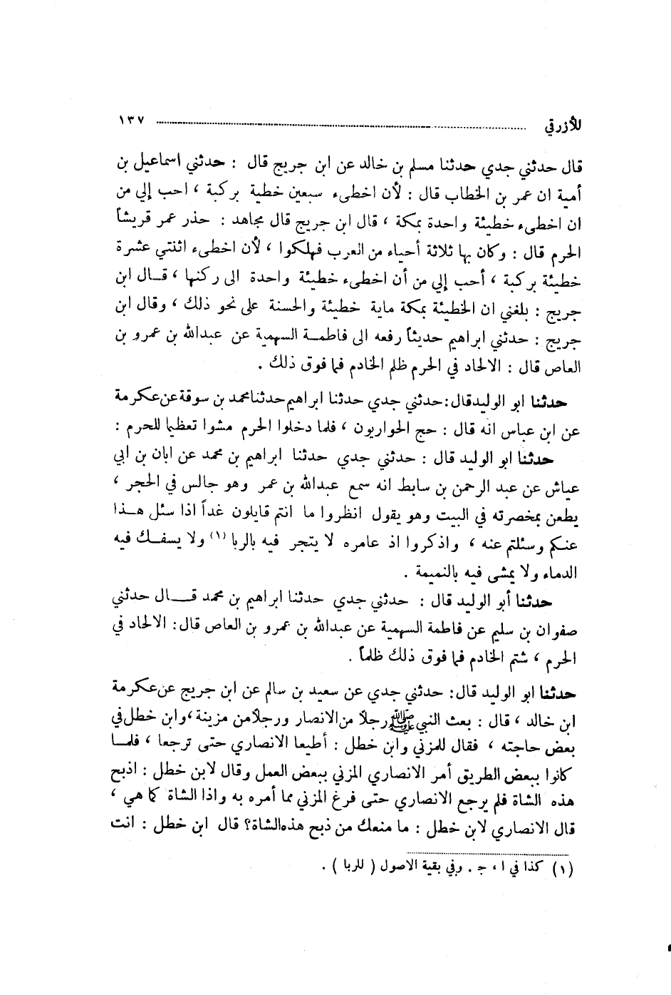 حَدَّثَنِي جَدِّي، حَدَّثَنَا مُسْلِمُ بْنُ خَالِدٍ، عَنِ ابْنِ جُرَيْجٍ، قَالَ: حَدَّثَنِي إِسْمَاعِيلُ بْنُ أُمَيَّةَ، أَنَّ عُمَرَ بْنَ الْخَطَّابِ قَالَ: «§لَأَنْ أُخْطِئَ سَبْعِينَ خَطِيَّةً بِرُكْبَةَ، أَحَبُّ إِلَيَّ مِنْ أَنْ أُخْطِئَ خَطِيئَةً وَاحِدَةً بِمَكَّةَ»
