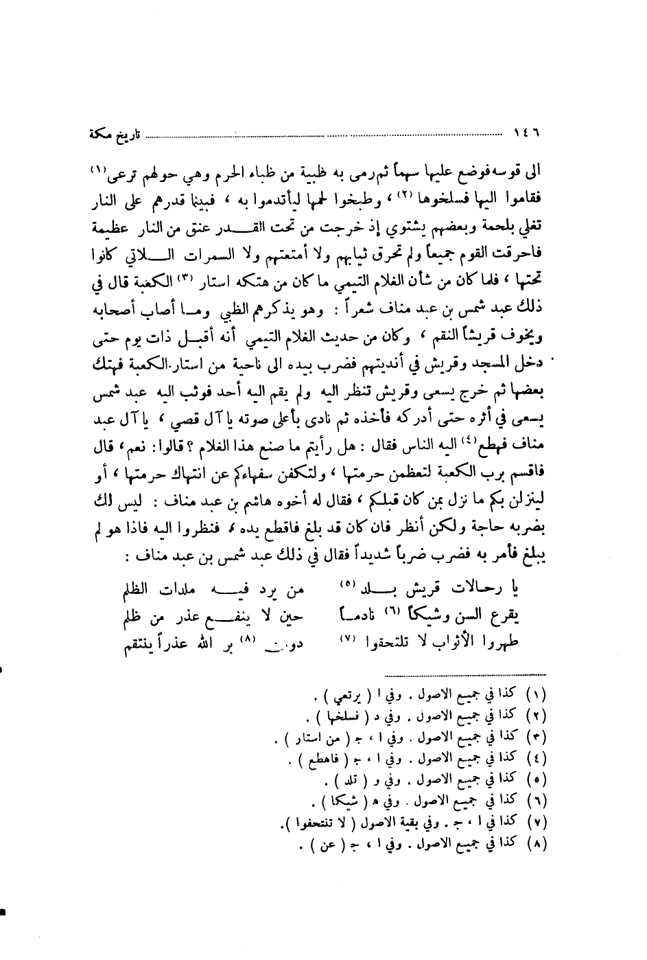 إِلَى قَوْسِهِ، فَوَضَعَ عَلَيْهَا سَهْمًا، ثُمَّ رَمَى بِهِ ظَبْيَةً مِنْ ظِبَاءِ الْحَرَمِ وَهِيَ حَوْلَهُمْ تَرْعَى، فَقَامُوا إِلَيْهَا فَسَلَخُوهَا، وَطَبَخُوا لَحْمَهَا لِيَأْتَدِمُوا بِهِ، فَبَيْنَمَا قِدْرُهُمْ عَلَى النَّارِ تَغْلِي بِلَحْمِهِ وَبَعْضُهُمْ يَشْتَوِي، إِذْ خَرَجَتْ مِنْ تَحْتِ الْقِدْرِ عُنُقٌ مِنَ النَّارِ عَظِيمَةٌ، فَأَحْرَقَتِ الْقَوْمَ جَمِيعًا، وَلَمْ تَحْرِقْ ثِيَابَهُمْ وَلَا أَمْتِعَتَهُمْ وَلَا السَّمُرَاتِ اللَّاتِي كَانُوا تَحْتَهَا، فَلَمَّا كَانَ مِنْ شَأْنِ الْغُلَامِ التَّيْمِيِّ مَا كَانَ مِنْ هَتْكِهِ أَسْتَارَ الْكَعْبَةِ، قَالَ فِي ذَلِكَ عَبْدُ شَمْسِ بْنِ عَبْدِ مَنَافٍ شِعْرًا، وَهُوَ يُذَكِّرُهُمُ الظَّبْيَ وَمَا أَصَابَ أَصْحَابَهُ، وَيُخَوِّفُ قُرَيْشًا النِّقَمَ وَكَانَ مِنْ حَدِيثِ الْغُلَامِ التَّيْمِيِّ أَنَّهُ أَقْبَلَ ذَاتَ يَوْمٍ حَتَّى دَخَلَ الْمَسْجِدَ وَقُرَيْشٌ فِي أَنْدِيَتِهِمْ، فَضَرَبَ بِيَدِهِ إِلَى نَاحِيَةٍ مِنْ أَسْتَارِ الْكَعْبَةِ، فَهَتَكَ بَعْضَهَا، ثُمَّ خَرَجَ يَسْعَى وَقُرَيْشٌ تَنْظُرُ إِلَيْهِ، وَلَمْ يَقُمْ إِلَيْهِ أَحَدٌ، فَوَثَبَ إِلَيْهِ عَبْدُ شَمْسٍ يَسْعَى فِي أَثَرِهِ حَتَّى أَدْرَكَهُ، فَأَخَذَهُ ثُمَّ نَادَى بِأَعْلَى صَوْتِهِ: يَا آلَ قُصَيٍّ، يَا آلَ عَبْدِ مَنَافٍ، فَهَطَعَ إِلَيْهِ النَّاسُ، فَقَالَ: §هَلْ رَأَيْتُمْ مَا صَنَعَ هَذَا الْغُلَامُ؟ قَالُوا: نَعَمْ قَالَ: فَأُقْسِمُ بِرَبِّ الْكَعْبَةِ لَتُعَظِّمُنَّ حُرْمَتَهَا، وَلَتَكُفُّنَّ سُفَهَاءَكُمْ عَنِ انْتِهَاكِ حُرْمَتِهَا، أَوْ لَيَنْزِلَنَّ بِكُمْ مَا نَزَلَ بِمَنْ كَانَ قَبْلَكُمْ فَقَالَ لَهُ أَخُوهُ هَاشِمُ بْنُ عَبْدِ مَنَافٍ: لَيْسَ لَكَ بِضَرْبِهِ حَاجَةٌ، وَلَكِنِ انْظُرْ، فَإِنْ كَانَ قَدْ بَلَغَ فَاقْطَعْ يَدَهُ فَنَظَرُوا إِلَيْهِ فَإِذَا هُوَ لَمْ يَبْلُغْ، فَأَمَرَ بِهِ فَضُرِبَ ضَرْبًا شَدِيدًا، فَقَالَ فِي ذَلِكَ عَبْدُ شَمْسِ بْنِ عَبْدِ مَنَافٍ: