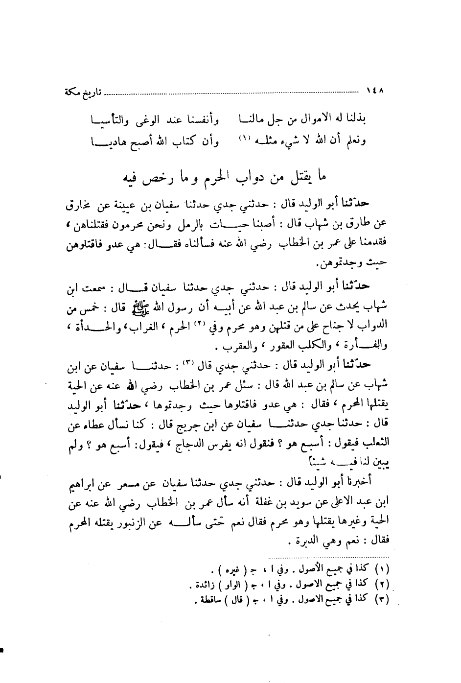 حَدَّثَنَا أَبُو الْوَلِيدِ، قَالَ: حَدَّثَنِي جَدِّي، حَدَّثَنَا سُفْيَانُ بْنُ عُيَيْنَةَ، عَنْ مُخَارِقٍ، عَنْ طَارِقِ بْنِ شِهَابٍ، قَالَ: أَصَبْنَا حَيَّاتٍ بِالرَّمَلِ وَنَحْنُ مُحْرِمُونَ فَقَتَلْنَاهُنَّ، فَقَدِمْنَا عَلَى عُمَرَ بْنِ الْخَطَّابِ رَضِيَ اللَّهُ عَنْهُ، فَسَأَلْنَاهُ، فَقَالَ: §هِيَ عَدُوٌّ، فَاقْتُلُوهُنَّ حَيْثُ وَجَدْتُمُوهُنَّ