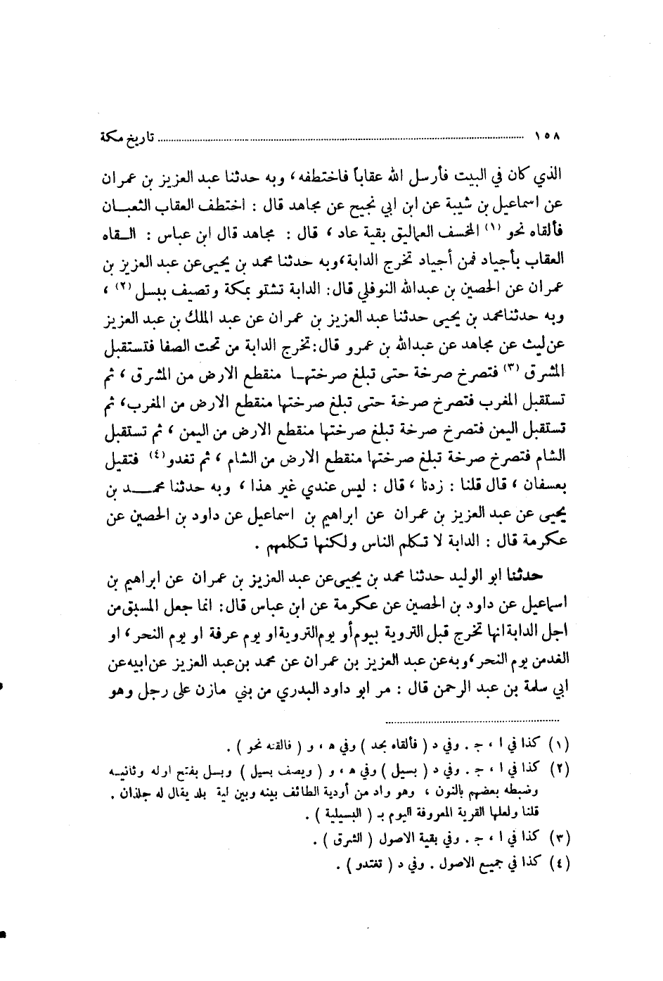 وَبِهِ حَدَّثَنَا عَبْدُ الْعَزِيزِ بْنُ عِمْرَانَ، عَنْ إِسْمَاعِيلَ بْنِ شَيْبَةَ، عَنِ ابْنِ أَبِي نَجِيحٍ، عَنْ مُجَاهِدٍ قَالَ: §اخْتَطَفَ الْعُقَابُ الثُّعْبَانَ، فَأَلْقَاهُ نَحْوَ الْمَخْسَفِ الْعَمَالِيقِ بَقِيَّةِ عَادٍ " قَالَ مُجَاهِدٌ قَالَ ابْنُ عَبَّاسٍ: أَلْقَاهُ الْعُقَابُ بِأَجْيَادٍ، فَمِنْ أَجْيَادٍ تَخْرُجُ الدَّابَّةُ "