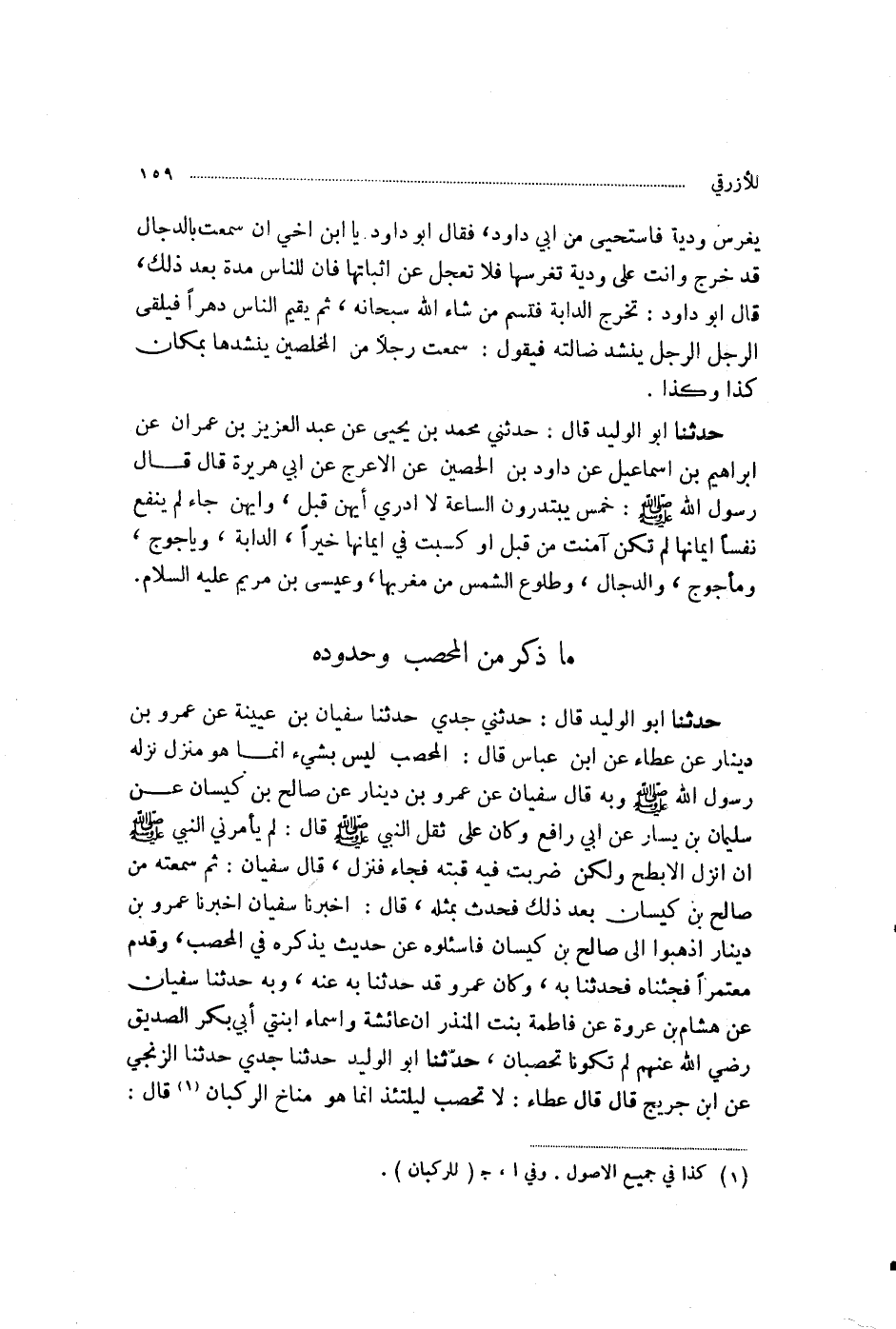 حَدَّثَنَا أَبُو الْوَلِيدِ، قَالَ: حَدَّثَنَا جَدِّي، حَدَّثَنَا الزَّنْجِيُّ، عَنِ ابْنِ جُرَيْجٍ، قَالَ: قَالَ عَطَاءٌ: لَا تَحْصِبْ لَيْلَتَئِذٍ، إِنَّمَا هُوَ مُنَاخُ الرُّكْبَانِ قَالَ -[160]-: وَكَانَ أَهْلُ الْجَاهِلِيَّةِ يَحْصِبُونَ قَالَ ابْنُ جُرَيْجٍ: وَكُنْتُ أَسْمَعُ النَّاسَ يَقُولُونَ لِعَطَاءٍ: إِنَّمَا نَزَلَ رَسُولُ اللَّهِ صَلَّى اللهُ عَلَيْهِ وَسَلَّمَ لَيْلَتَئِذٍ الْمُحَصَّبَ يَنْتَظِرُ عَائِشَةَ، فَيَقُولُ: لَا، وَلَكِنْ إِنَّمَا هُوَ مُنَاخٌ لِلرُّكْبَانِ فَيَقُولُ: §مَنْ شَاءَ حَصَبَ، وَمَنْ شَاءَ لَمْ يَحْصِبْ "