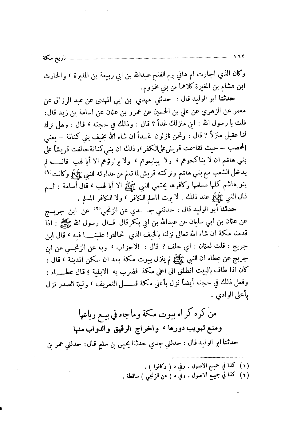 وَبِهِ عَنِ الزَّنْجِيِّ، عَنِ ابْنِ جُرَيْجٍ، عَنْ عَطَاءٍ أَنَّ النَّبِيَّ صَلَّى اللهُ عَلَيْهِ وَسَلَّمَ §لَمْ يَنْزِلْ بُيُوتَ مَكَّةَ بَعْدَ أَنْ سَكَنَ الْمَدِينَةَ قَالَ: كَانَ إِذَا طَافَ بِالْبَيْتِ انْطَلَقَ إِلَى أَعْلَى مَكَّةَ، فَضَرَبَ بِهِ الْأَبْنِيَةَ " قَالَ عَطَاءٌ: وَفَعَلَ ذَلِكَ فِي حَجَّتِهِ أَيْضًا، نَزَلَ بِأَعْلَى مَكَّةَ قَبْلَ التَّعْرِيفِ، وَلَيْلَةَ الصَّدْرِ نَزَلَ بِأَعْلَى الْوَادِي