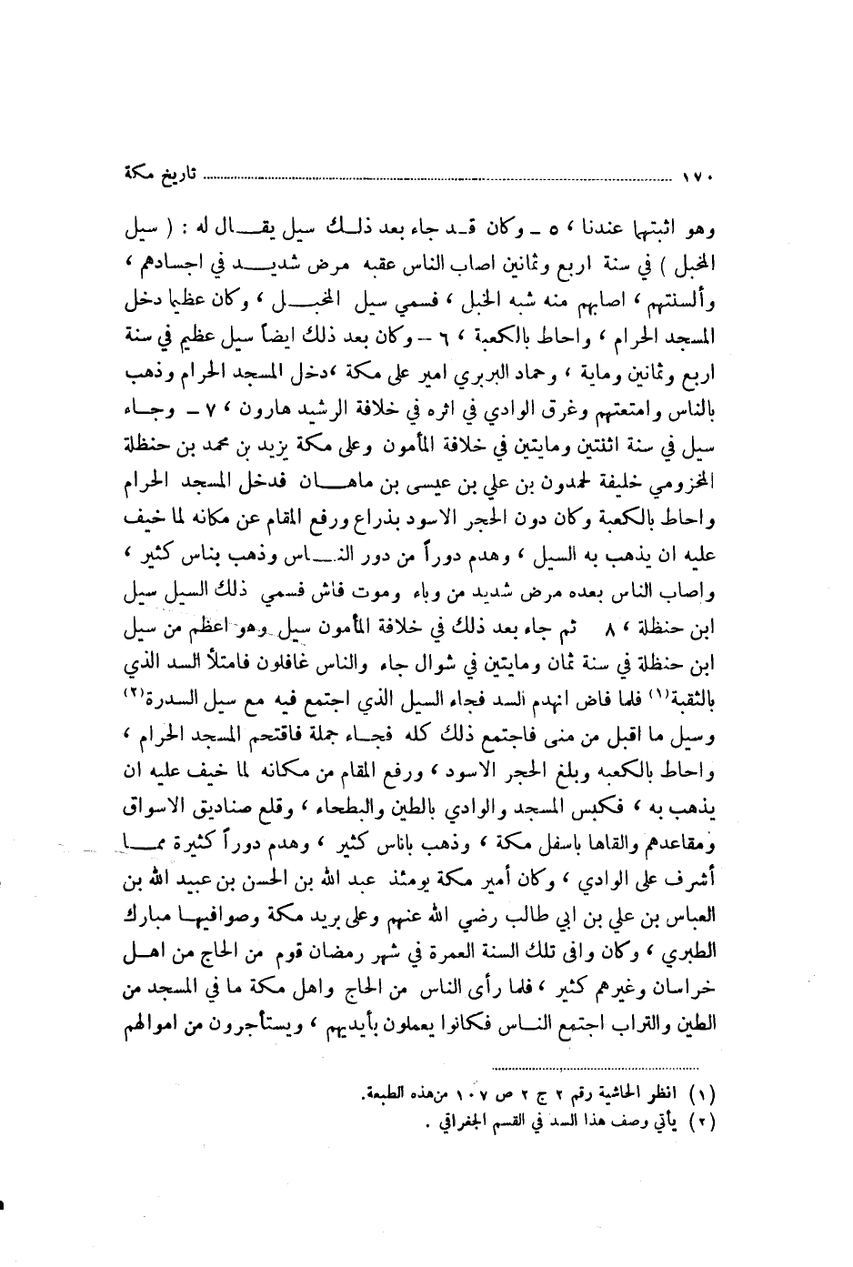 8 - ثُمَّ جَاءَ بَعْدَ ذَلِكَ فِي خِلَافَةِ الْمَأْمُونِ سَيْلٌ، وَهُوَ أَعْظَمُ مِنْ سَيْلِ ابْنِ حَنْظَلَةَ، فِي سَنَةِ ثَمَانٍ وَمِائَتَيْنِ فِي شَوَّالٍ، جَاءَ وَالنَّاسُ غَافِلُونَ، فَامْتَلَأَ السَّدُّ الَّذِي بِالثَّقَبَةِ، فَلَمَّا فَاضَ انْهَدَمَ السَّدُّ، فَجَاءَ السَّيْلُ الَّذِي اجْتَمَعَ فِيهِ مَعَ سَيْلِ السِّدْرَةِ وَسَيْلِ مَا أَقْبَلَ مِنْ مِنًى، فَاجْتَمَعَ ذَلِكَ كُلُّهُ، فَجَاءَ جُمْلَةً، فَاقْتَحَمَ الْمَسْجِدَ الْحَرَامَ، وَأَحَاطَ بِالْكَعْبَةِ، وَبَلَغَ الْحَجَرَ الْأَسْوَدَ، وَرُفِعَ الْمَقَامُ مِنْ مَكَانِهِ لَمَّا خِيفَ عَلَيْهِ أَنْ يَذْهَبَ بِهِ، فَكَبَسَ الْمَسْجِدَ وَالْوَادِيَ بِالطِّينِ وَالْبَطْحَاءِ، وَقَلَعَ صَنَادِيقَ الْأَسْوَاقِ وَمَقَاعِدَهُمْ، وَأَلْقَاهَا بِأَسْفَلِ مَكَّةَ، وَذَهَبَ بِأُنَاسٍ كَثِيرٍ، وَهَدَمَ دُورًا كَثِيرَةً مِمَّا أَشْرَفَ عَلَى الْوَادِي، وَكَانَ أَمِيرُ مَكَّةَ يَوْمَئِذٍ عَبْدَ اللَّهِ بْنَ الْحَسَنِ بْنِ عُبَيْدِ اللَّهِ بْنِ الْعَبَّاسِ بْنِ عَلِيِّ بْنِ أَبِي طَالِبٍ رَضِيَ اللَّهُ عَنْهُمْ، وَعَلَى بَرِيدِ مَكَّةَ وَصَوَافِيهَا مُبَارَكٌ الطَّبَرِيُّ، وَكَانَ وَافَى تِلْكَ السَّنَةَ الْعُمْرَةَ فِي شهر رَمَضَانَ قَوْمٌ مِنَ الْحَاجِّ مِنْ أَهْلِ خُرَاسَانَ وَغَيْرُهُمْ كَثِيرٌ، فَلَمَّا رَأَى النَّاسُ مِنَ الْحَاجِّ وَأَهْلُ مَكَّةَ مَا فِي الْمَسْجِدِ مِنَ الطِّينِ وَالتُّرَابِ، اجْتَمَعَ النَّاسُ فَكَانُوا يَعْمَلُونَ بِأَيْدِيهِمْ، وَيَسْتَأْجِرُونَ مِنْ أَمْوَالِهِمْ