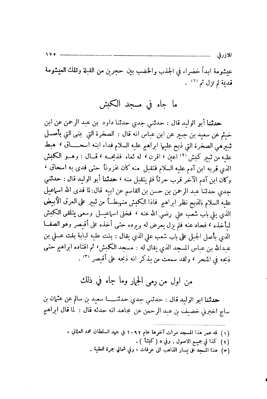 حَدَّثَنَا أَبُو الْوَلِيدِ، قَالَ: حَدَّثَنِي جَدِّي، حَدَّثَنَا عَبْدُ الرَّحْمَنِ بْنُ حَسَنِ بْنِ الْقَاسِمِ، عَنْ أَبِيهِ، قَالَ: §لَمَّا فَدَى اللَّهُ إِسْمَاعِيلَ عَلَيْهِ السَّلَامُ بِالذَّبْحِ نَظَرَ إِبْرَاهِيمُ، فَإِذَا الْكَبْشُ مُنْهَبِطًا مِنْ ثَبِيرٍ عَلَى الْعَرْقِ الْأَبْيَضِ الَّذِي يَلِي بَابَ شِعْبِ عَلِيٍّ رَضِيَ اللَّهُ عَنْهُ، فَخَلَّى إِسْمَاعِيلَ، وَسَعَى يَتَلَقَّى الْكَبْشَ لِيَأْخُذَهُ، فَحَادَ عَنْهُ، فَلَمْ يَزَلْ يَعْرِضُ لَهُ وَيَرُدُّهُ حَتَّى أَخَذَهُ عَلَى أُقَيْصِرٍ - وَهُوَ الصَّفَا الَّذِي بِأَصْلِ الْجَبَلِ عَلَى بَابِ شِعْبِ عَلِيٍّ، الَّذِي يُقَالُ: بَنَتْ عَلَيْهِ لُبَابَةُ بِنْتُ عَلِيِّ بْنِ عَبْدِ اللَّهِ بْنِ عَبَّاسٍ الْمَسْجِدَ الَّذِي يُقَالُ لَهُ مَسْجِدُ الْكَبْشِ - ثُمَّ اقْتَادَهُ إِبْرَاهِيمُ حَتَّى ذَبَحَهُ فِي الْمَنْحَرِ وَلَقَدْ سَمِعْتُ مَنْ يَذْكُرُ أَنَّهُ ذَبَحَهُ عَلَى أُقَيْصِرٍ "