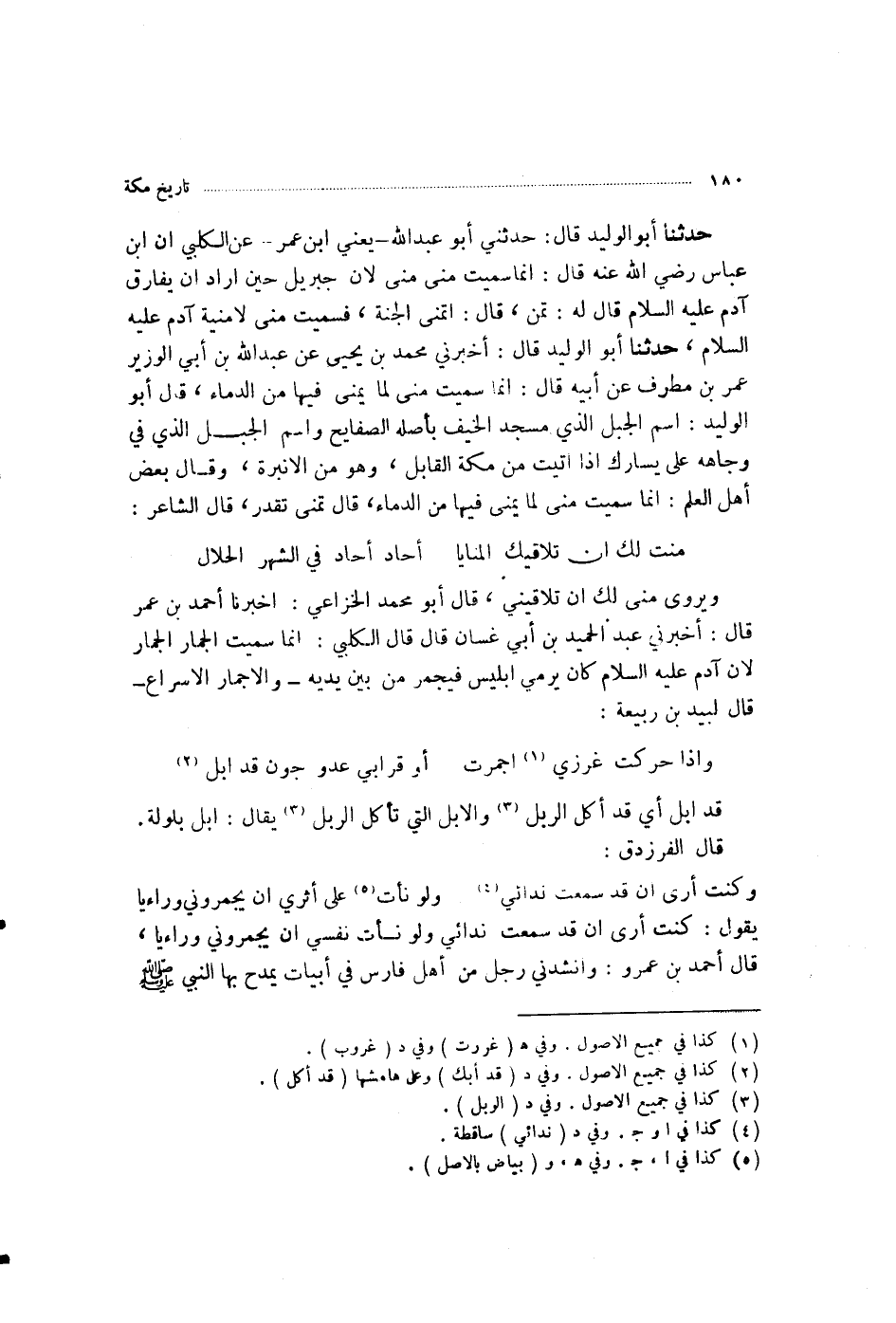 حَدَّثَنَا أَبُو الْوَلِيدِ، قَالَ: حَدَّثَنِي أَبُو عَبْدِ اللَّهِ يَعْنِي ابْنَ عُمَرَ عَنِ الْكَلْبِيِّ، أَنَّ ابْنَ عَبَّاسٍ، رَضِيَ اللَّهُ عَنْهُ قَالَ: إِنَّمَا §سُمِّيَتْ مِنًى مِنًى؛ لِأَنَّ جِبْرِيلَ حِينَ أَرَادَ أَنْ يُفَارِقَ آدَمَ عَلَيْهِ السَّلَامُ قَالَ لَهُ: تَمَنَّ , قَالَ: أَتَمَنَّى الْجَنَّةَ فَسُمِّيَتْ مِنًى لِأُمْنِيَّةِ آدَمَ عَلَيْهِ السَّلَامُ "