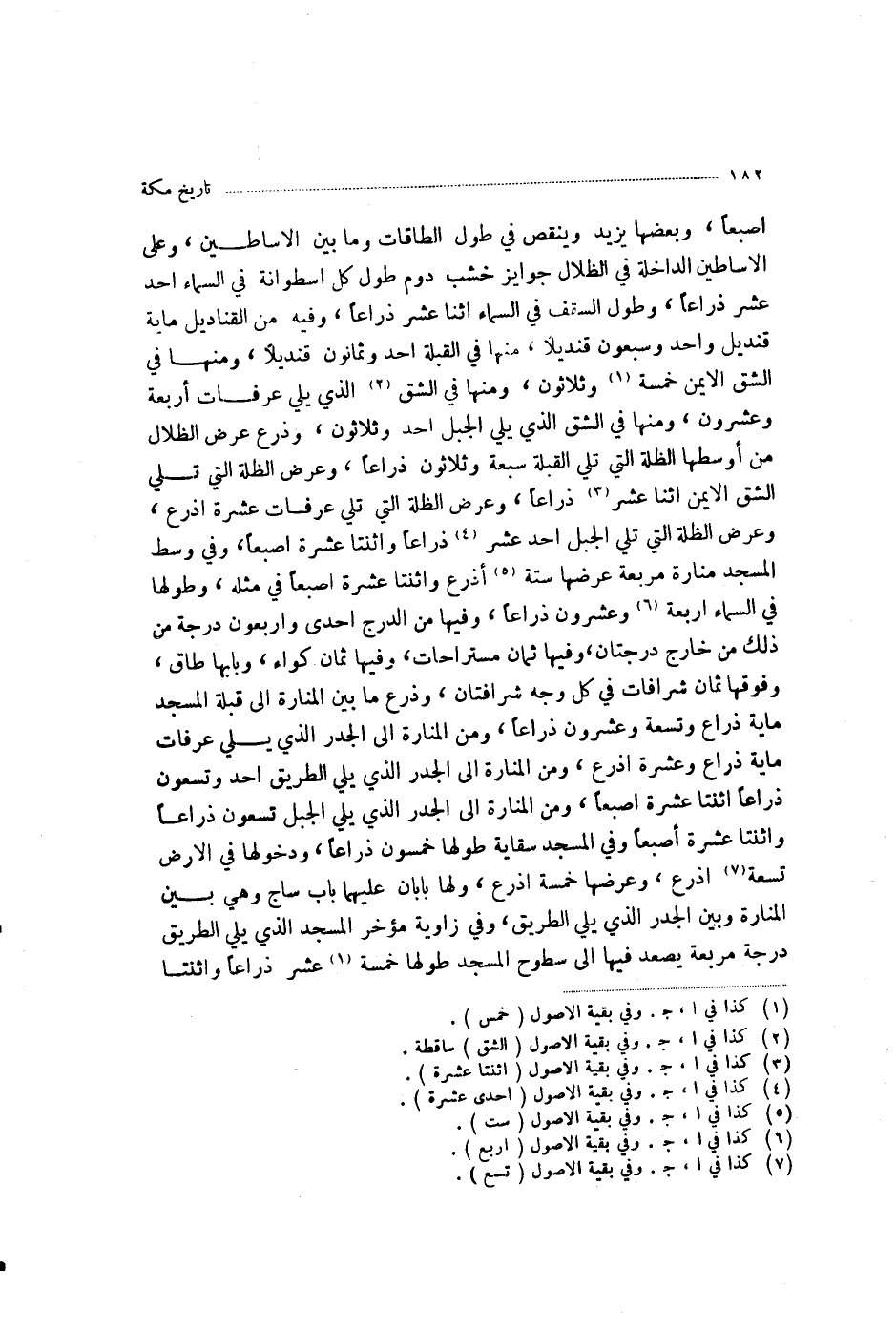 إِصْبَعًا، وَبَعْضُهَا يَزِيدُ وَيَنْقُصُ فِي طُولِ الطَّاقَاتِ، وَمَا بَيْنَ الْأَسَاطِينِ، وَعَلَى الْأَسَاطِينِ الدَّاخِلَةِ فِي الظِّلَالِ جَوَايِزُ خَشَبِ دَوْمٍ، طُولُ كُلِّ أُسْطُوَانَةٍ فِي السَّمَاءِ أَحَدَ عَشَرَ ذِرَاعًا، وَطُولُ السَّقْفِ فِي السَّمَاءِ اثْنَا عَشَرَ ذِرَاعًا، وَفِيهِ مِنَ الْقَنَادِيلِ مِائَةُ قِنْدِيلٍ , وَاحِدٌ وَسَبْعُونَ قِنْدِيلًا، مِنْهَا فِي الْقِبْلَةِ وَاحَدَ وَثَمَانُونَ قِنْدِيلًا، وَمِنْهَا فِي الشِّقِّ الْأَيْمَنِ خَمْسَةٌ وَثَلَاثُونَ، وَمِنْهَا فِي الشِّقِّ الَّذِي يَلِي عَرَفَاتٍ أَرْبَعَةٌ وَعِشْرُونَ، وَمِنْهَا فِي الشِّقِّ الَّذِي يَلِي الْجَبَلَ وَاحِدٌ وَثَلَاثُونَ , وَذَرْعُ عَرْضِ الظِّلَالِ مِنْ أَوْسَطِهَا الظُّلَّةُ الَّتِي تَلِي الْقِبْلَةَ سَبْعَةٌ وَثَلَاثُونَ ذِرَاعًا، وَعَرْضُ الظُّلَّةِ الَّتِي تَلِي الشِّقَّ الْأَيْمَنَ اثْنَا عَشَرَ ذِرَاعًا، وَعَرْضُ الظُّلَّةِ تَلِي عَرَفَاتٍ عَشَرَةُ أَذْرُعٍ، وَعَرْضُ الظُّلَّةِ الَّتِي تَلِي الْجَبَلَ أَحَدَ عَشَرَ ذِرَاعًا، وَاثْنَا عَشَرَ إِصْبَعًا، وَفِي وَسَطِ الْمَسْجِدِ مَنَارَةٌ مُرَبَّعَةٌ عَرْضُهَا سِتَّةُ أَذْرُعٍ، وَاثْنَا عَشَرَ إِصْبَعًا مِثْلُهُ، وَطُولُهَا فِي السَّمَاءِ أَرْبَعَةٌ وَعِشْرُونَ ذِرَاعًا، وَفِيهَا مِنَ الدَّرَجِ إِحْدَى وَأَرْبَعُونَ دَرَجَةً، مِنْ ذَلِكَ مِنْ خَارِجٍ دَرَجَتَانِ، وَفِيهَا ثَمَانِ مُسْتَرَاحَاتٍ، وَفِيهَا ثَمَانِ كُوَاءٍ، وَبَابُهَا طَاقٌ، وَفَوْقَهَا ثَمَانِ شُرَّافَاتٍ، فِي كُلِّ وَجْهٍ شُرَّافَتَانِ وَذَرْعُ مَا بَيْنَ الْمَنَارَةِ إِلَى قِبْلَةِ الْمَسْجِدِ مِائَةُ ذِرَاعٍ وَتِسْعَةٌ وَعِشْرُونَ ذِرَاعًا، وَمِنَ الْمَنَارَةِ إِلَى الْجَدْرِ الَّذِي يَلِي عَرَفَاتٍ مِائَةُ ذِرَاعٍ وَعَشَرَةُ أَذْرُعٍ، وَمِنَ الْمَنَارَةِ إِلَى الْجَدْرِ الَّذِي يَلِي الطَّرِيقَ أَحَدٌ وَتِسْعُونَ ذِرَاعًا وَاثْنَا عَشَرَ إِصْبَعًا، وَمِنَ الْمَنَارَةِ إِلَى الْجَدْرِ الَّذِي يَلِي الْجَبَلَ تِسْعُونَ ذِرَاعًا وَاثْنَا عَشَرَ إِصْبَعًا، وَفِي الْمَسْجِدِ سِقَايَةٌ طُولُهَا خَمْسُونَ ذِرَاعًا، وَدُخُولُهَا فِي الْأَرْضِ تِسْعَةُ أَذْرُعٍ، وَعَرْضُهَا خَمْسَةُ أَذْرُعٍ، وَلَهَا بَابَانِ عَلَيْهِمَا بَابُ سَاجٍ، وَهِيَ بَيْنَ الْمَنَارَةِ وَبَيْنَ الْجَدْرِ الَّذِي يَلِي الطَّرِيقَ، وَفِي زَاوِيَةِ مُؤَخَّرِ الْمَسْجِدِ الَّذِي يَلِي الطَّرِيقَ دَرَجَةٌ مُرَبَّعَةٌ، يُصْعَدُ فِيهَا إِلَى سُطُوحِ الْمَسْجِدِ، طُولُهَا خَمْسَةَ عَشَرَ ذِرَاعًا وَاثْنَتَا