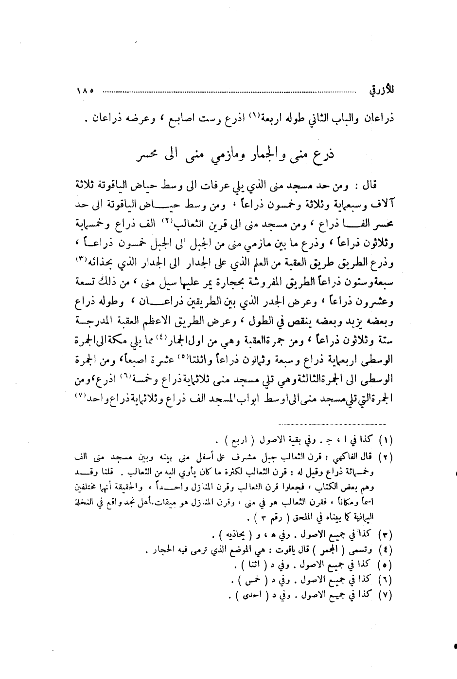 §ذَرْعُ مِنًى وَالْجِمَارِ وَمَأْزِمَيْ مِنًى إِلَى مُحَسِّرٍ قَالَ: وَمِنْ حَدِّ مَسْجِدِ مِنًى الَّذِي يَلِي عَرَفَاتٍ إِلَى وَسَطِ حِيَاضِ الْيَاقُوتَةِ ثَلَاثَةُ آلَافٍ وَسَبْعُمِائَةٍ وَثَلَاثَةٌ وَخَمْسُونَ ذِرَاعًا، وَمِنْ وَسَطِ حِيَاضِ الْيَاقُوتَةِ إِلَى حَدِّ مُحَسِّرٍ أَلْفَا ذِرَاعٍ، وَمِنْ مَسْجِدِ مِنًى إِلَى قَرِينِ الثَّعَالِبِ أَلْفُ ذِرَاعٍ وَخَمْسُمِائَةٍ وَثَلَاثُونَ ذِرَاعًا، وَذَرْعُ مَا بَيْنَ مَأْزِمَيْ مِنًى مِنَ الْجَبَلِ إِلَى الْجَبَلِ خَمْسُونَ ذِرَاعًا، وَذَرْعُ الطَّرِيقِ طَرِيقِ الْعَقَبَةِ مِنَ الْعَلَمِ الَّذِي عَلَى الْجِدَارِ إِلَى الْجِدَارِ الَّذِي بِحِذَائِهِ سَبْعَةٌ وَسِتُّونَ ذِرَاعًا، الطَّرِيقُ الْمَفْرُوشَةُ بِحِجَارَةٍ يَمُرُّ عَلَيْهَا سَيْلُ مِنًى، مِنْ ذَلِكَ تِسْعَةٌ وَعِشْرُونَ ذِرَاعًا، وَعَرْضُ الْجَدْرِ الَّذِي بَيْنَ الطَّرِيقَيْنِ ذِرَاعَانِ، وَطُولُهُ ذِرَاعٌ، وَبَعْضُهُ يَزِيدُ وَبَعْضُهُ يَنْقُصُ فِي الطُّوَلِ، وَعَرْضُ الطَّرِيقِ الْأَعْظَمِ الْعَقَبَةِ الْمُدَرَّجَةِ سِتَّةٌ وَثَلَاثُونَ ذِرَاعًا، وَمِنْ جَمْرَةِ الْعَقَبَةِ - وَهِيَ مِنْ أَوَّلِ الْجِمَارِ - مِمَّا يَلِي مَكَّةَ إِلَى الْجَمْرَةِ الْوُسْطَى أَرْبَعُمِائَةِ ذِرَاعٍ، وَسَبْعَةٌ وَثَمَانُونَ ذِرَاعًا، وَاثْنَتَا عَشَرَ إِصْبَعًا، وَمِنَ الْجَمْرَةِ الْوُسْطَى إِلَى الْجَمْرَةِ الثَّالِثَةِ - وَهِيَ تَلِي مَسْجِدَ مِنًى - ثَلَاثُمِائَةِ ذِرَاعٍ وَخَمْسَةَ أَذْرُعٍ، وَمِنَ الْجَمْرَةِ الَّتِي تَلِي مَسْجِدَ مِنًى إِلَى أَوْسَطِ أَبْوَابِ الْمَسْجِدِ أَلْفُ ذِرَاعٍ وَثَلَاثُمِائَةِ ذِرَاعٍ، وَأَحَدٌ