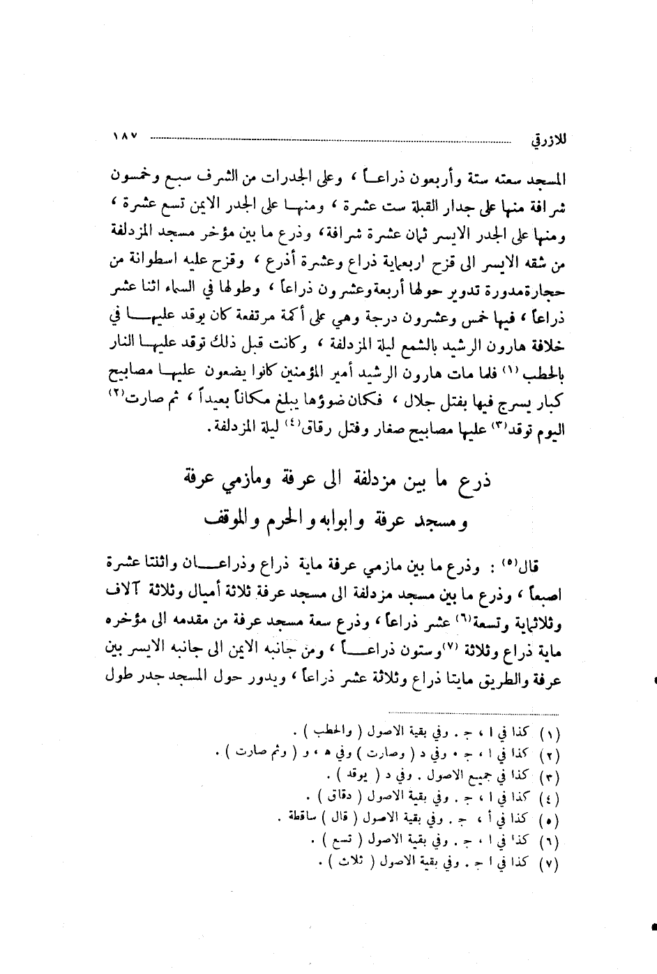 §ذَرْعُ مَا بَيْنَ مُزْدَلِفَةَ إِلَى عَرَفَةَ، وَمَأْزِمَيْ عَرَفَةَ، وَمَسْجِدِ عَرَفَةَ وَأَبْوَابِهِ، وَالْحَرَمِ وَالْمَوْقِفِ قَالَ: وَذَرْعُ مَا بَيْنَ مَأْزِمَيْ عَرَفَةَ مِائَةُ ذِرَاعٍ وَذِرَاعَانِ، وَاثْنَتَا عَشَرَةَ إِصْبَعًا، وَذَرْعُ مَا بَيْنَ مَسْجِدِ مُزْدَلِفَةَ إِلَى مَسْجِدِ عَرَفَةَ ثَلَاثَةُ أَمْيَالٍ، وَثَلَاثَةُ آلَافٍ وَثَلَاثُمِائَةٍ وَتِسْعَ عَشَرَةَ ذِرَاعًا، وَذَرْعُ سَعَةِ مَسْجِدِ عَرَفَةَ مِنْ مُقَدَّمِهِ إِلَى مُؤَخَّرِهِ مِائَةُ ذِرَاعٍ، وَثَلَاثَةٌ وَسِتُّونَ ذِرَاعًا، وَمِنْ جَانِبِهِ الْأَيْمَنِ إِلَى جَانِبِهِ الْأَيْسَرِ بَيْنَ عَرَفَةَ وَالطَّرِيقِ مِائَتَا ذِرَاعٍ، وَثَلَاثَةَ عَشَرَ ذِرَاعًا، وَيَدُورُ حَوْلَ الْمَسْجِدِ جُدُرٌ، طُولُ