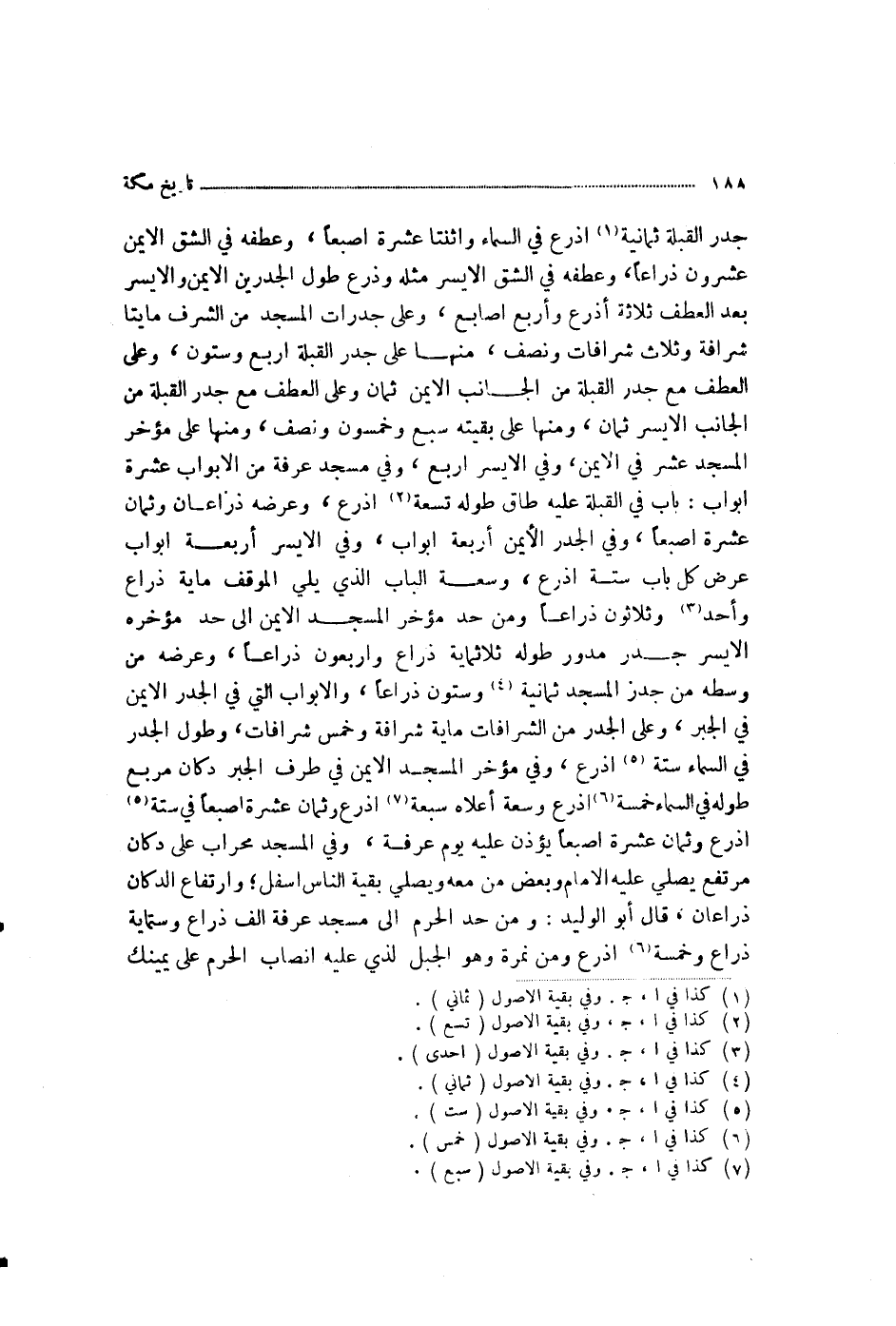 جَدْرِ الْقِبْلَةِ ثَمَانِيَةُ أَذْرُعٍ فِي السَّمَاءِ، وَاثْنَتَا عَشَرَةَ إِصْبَعًا، وَعِطْفُهُ فِي الشِّقِّ الْأَيْمَنِ عِشْرُونَ ذِرَاعًا، وَعِطْفُهُ فِي الشِّقِّ الْأَيْسَرِ مِثْلُهُ، وَذَرْعُ طُولِ الْجَدْرَيْنِ الْأَيْمَنِ وَالْأَيْسَرِ بَعْدَ الْعِطْفِ ثَلَاثَةُ أَذْرُعٍ وَأَرْبَعَةُ أَصَابِعِ، وَعَلَى جُدُرَاتِ الْمَسْجِدِ مِنَ الشُّرَفِ مِائَتَا شُرَّافَةٍ وَثَلَاثُ شُرَّافَاتٍ وَنِصْفٌ، مِنْهَا عَلَى جَدْرِ الْقِبْلَةِ أَرْبَعٌ وَسِتُّونَ، وَعَلَى الْعِطْفِ مَعَ جَدْرِ الْقِبْلَةِ مِنَ الْجَانِبِ الْأَيْمَنِ ثَمَانٍ، وَعَلَى الْعِطْفِ مَعَ جَدْرِ الْقِبْلَةِ مِنَ الْجَانِبِ الْأَيْسَرِ ثَمَانٍ , وَمِنْهَا عَلَى بَقِيَّتِهِ سَبْعٌ وَخَمْسُونَ وَنِصْفٌ، وَمِنْهَا عَلَى مُؤَخَّرِ الْمَسْجِدِ عَشْرٌ فِي الْأَيْمَنِ، وَفِي الْأَيْسَرِ أَرْبَعٌ، وَفِي مَسْجِدِ عَرَفَةَ مِنَ الْأَبْوَابِ عَشَرَةُ أَبْوَابٍ: بَابٌ فِي الْقِبْلَةِ عَلَيْهِ طَاقٌ طُولُهُ تِسْعَةُ أَذْرُعٍ، وَعَرْضُهُ ذِرَاعَانِ وَثَمَانِيَةَ عَشَرَةَ إِصْبَعًا، وَفِي الْجَدْرِ الْأَيْمَنِ أَرْبَعَةُ أَبْوَابٍ، وَفِي الْأَيْسَرِ أَرْبَعَةُ أَبْوَابٍ، عَرْضُ كُلِّ بَابٍ سِتَّةُ أَذْرُعٍ، وَسَعَةُ الْبَابِ الَّذِي يَلِي الْمَوْقِفَ مِائَةُ ذِرَاعٍ وَأَحَدٌ وَثَلَاثُونَ ذِرَاعًا، وَمِنْ حَدِّ مُؤَخَّرِ الْمَسْجِدِ الْأَيْمَنِ إِلَى حَدِّ مُؤَخَّرِهِ الْأَيْسَرِ جَدْرٌ مُدَوَّرٌ طُولُهُ ثَلَاثُمِائَةِ ذِرَاعٍ وَأَرْبَعُونَ ذِرَاعًا، وَعَرْضُهُ مِنْ وَسَطِهِ مِنْ جَدْرِ الْمَسْجِدِ ثَمَانِيَةٌ وَسِتُّونَ ذِرَاعًا، وَالْأَبْوَابُ الَّتِي فِي الْجَدْرِ الْأَيْمَنِ فِيِ الْجَبْرِ، عَلَى الْجَدْرِ مِنَ الشُّرَّافَاتِ مِائَةُ شُرَّافَةٍ، وَخَمْسُ شُرَّافَاتٍ، وَطُولُ الْجَدْرِ فِي السَّمَاءِ سِتَّةُ أَذْرُعٍ، وَفِي مُؤَخَّرِ الْمَسْجِدِ الْأَيْمَنِ فِي طَرَفِ الْجَدْرِ دُكَّانٌ مُرَبَّعٌ طُولُهُ خَمْسَةُ أَذْرُعٍ , وَسَعَةُ أَعْلَاهُ سَبْعَةُ أَذْرُعٍ، وَثَمَانِيَةَ عَشَرَ إِصْبَعًا فِي سِتَّةِ أَذْرُعٍ، وَثَمَانِيَةَ عَشَرَ إِصْبَعًا، يُؤَذَّنُ عَلَيْهِ يَوْمَ عَرَفَةَ، وَفِي الْمَسْجِدِ مِحْرَابٌ عَلَى دُكَّانٍ مُرْتَفِعٍ يُصَلِّي عَلَيْهِ الْإِمَامُ وَبَعْضُ مَنْ مَعَهُ، وَيُصَلِّي بَقِيَّةُ النَّاسِ أَسْفَلَ، وَارْتِفَاعُ الدُّكَّانِ ذِرَاعَانِ قَالَ أَبُو الْوَلِيدِ: وَمِنْ حَدِّ الْحَرَمِ إِلَى مَسْجِدِ عَرَفَةَ أَلْفُ ذِرَاعٍ وَسَتُّمِائَةِ ذِرَاعٍ وَخَمْسَةُ أَذْرُعٍ، وَمِنْ نَمِرَةَ - وَهُوَ الْجَبَلُ الَّذِي عَلَيْهِ أَنْصَابُ الْحَرَمِ عَلَى يَمِينِكَ
