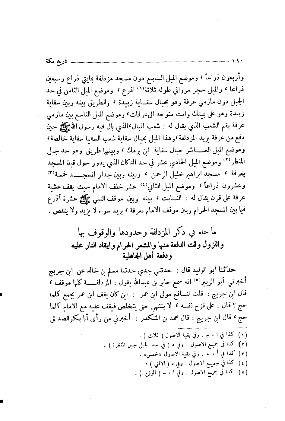 وَأَرْبَعُونَ ذِرَاعًا، وَمَوْضِعُ الْمِيلِ السَّابِعِ دُونَ مَسْجِدِ مُزْدَلِفَةَ بِمِائَتَيْ ذِرَاعٍ، وَسَبْعِينَ ذِرَاعًا، وَالْمِيلُ حَجَرٌ مَرْوَانِيٌّ طُولُهُ ثَلَاثَةُ أَذْرُعٍ، وَمَوْضِعُ الْمِيلِ الثَّامِنِ فِي حَدِّ الْجَبَلِ دُونَ مَأْزِمَيْ عَرَفَةَ، وَهُوَ بِحِيَالِ سِقَايَةِ زُبَيْدَةَ، وَالطَّرِيقُ بَيْنَهُ وَبَيْنَ سِقَايَةِ زُبَيْدَةَ، وَهُوَ عَلَى يَمِينِكَ وَأَنْتَ مُتَوَجِّهٌ إِلَى عَرَفَاتٍ، وَمَوْضِعُ الْمِيلِ التَّاسِعِ بَيْنَ مَأْزِمَيْ عَرَفَةَ بِفَمِ الشِّعْبِ الَّذِي يُقَالُ لَهُ شِعْبُ الْمَبَالِ، الَّذِي بَالَ فِيهِ رَسُولُ اللَّهِ صَلَّى اللهُ عَلَيْهِ وَسَلَّمَ حِينَ دَفَعَ مِنْ عَرَفَةَ يُرِيدُ الْمُزْدَلِفَةَ، وَهَذَا الْمِيلُ بِحِيَالِ سِقَايَةِ شِعْبِ السُّقْيَا سِقَايَةٍ خَالِصَةٍ، وَمَوْضِعُ الْمِيلِ الْعَاشِرِ حِيَالَ سِقَايَةِ ابْنِ بَرْمَكٍ، وَبَيْنَهُمَا طَرِيقٌ، وَهُوَ حَدُّ جَبَلِ الْمَنْظَرِ، وَمَوْضِعُ الْمِيلِ الْحَادِي عَشَرَ فِي حَدِّ الدُّكَّانِ الَّذِي يَدُورُ حَوْلَ قِبْلَةِ الْمَسْجِدِ بِعَرَفَةَ مَسْجِدِ إِبْرَاهِيمَ خَلِيلِ الرَّحْمَنِ، وَبَيْنَهُ وَبَيْنَ جِدَارِ الْمَسْجِدِ خَمْسَةٌ وَعِشْرُونَ ذِرَاعًا، وَمَوْضِعُ الْمِيلِ الثَّانِي عَشَرَ خَلْفَ الْإِمَامِ حَيْثُ يَقِفُ عَشِيَّةَ عَرَفَةَ عَلَى قَرْنٍ يُقَالُ لَهُ النَّابِتُ، بَيْنَهُ وَبَيْنَ مَوْقِفِ النَّبِيِّ صَلَّى اللهُ عَلَيْهِ وَسَلَّمَ عَشَرَةُ أَذْرُعٍ فِيمَا بَيْنَ الْمَسْجِدِ الْحَرَامِ، وَبَيْنَ مَوْقِفِ الْإِمَامِ بِعَرَفَةَ بَرِيدٌ سَوَاءٌ لَا يَزِيدُ وَلَا يَنْقُصُ