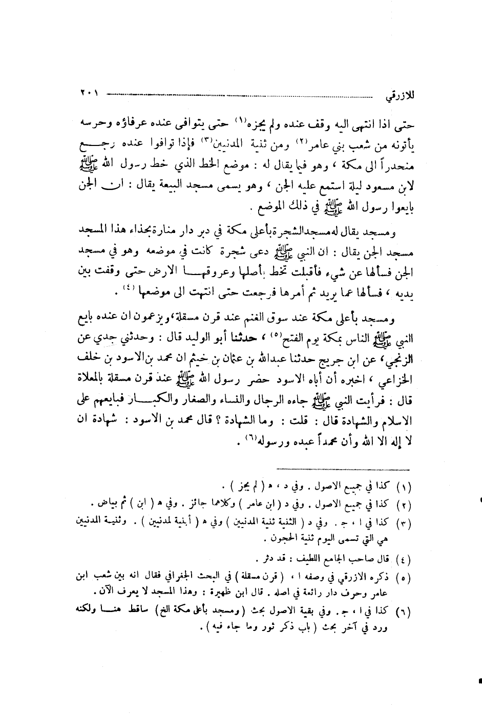 حَدَّثَنَا أَبُو الْوَلِيدِ، قَالَ: وَحَدَّثَنِي جَدِّي، عَنِ الزَّنْجِيِّ، عَنِ ابْنِ جُرَيْجٍ، حَدَّثَنَا عَبْدُ اللَّهِ بْنُ عُثْمَانَ بْنِ خَيْثَمٍ، أَنَّ مُحَمَّدَ بْنَ الْأَسْوَدِ بْنِ خَلَفٍ الْخُزَاعِيَّ، أَخْبَرَهُ أَنَّ أَبَاهُ الْأَسْوَدَ حَضَرَ رَسُولَ اللَّهِ صَلَّى اللهُ عَلَيْهِ وَسَلَّمَ عِنْدَ قَرْنِ مَسْقَلَةَ بِالْمَعْلَاةِ، قَالَ: فَرَأَيْتُ النَّبِيَّ صَلَّى اللهُ عَلَيْهِ وَسَلَّمَ جَاءَهُ الرِّجَالُ وَالنِّسَاءُ وَالصِّغَارُ وَالْكِبَارُ، " §فَبَايَعَهُمْ عَلَى الْإِسْلَامِ وَالشَّهَادَةِ قَالَ: قُلْتُ: وَمَا الشَّهَادَةُ؟ قَالَ مُحَمَّدُ بْنُ الْأَسْوَدِ: «شَهَادَةُ أَنْ لَا إِلَهَ إِلَّا اللَّهُ، وَأَنَّ مُحَمَّدًا عَبْدُهُ وَرَسُولُهُ» -[202]- وَمَسْجِدُ السُّرُرِ، وَهُوَ الْمَسْجِدُ الَّذِي يُسَمِّيهِ أَهْلُ مَكَّةَ مَسْجِدَ عَبْدِ الصَّمَدِ بْنِ عَلِيٍّ، كَانَ بَنَاهُ , وَمَسْجِدٌ بِعَرَفَةَ عَنْ يَمِينِ الْمَوْقِفِ، يُقَالُ لَهُ مَسْجِدُ إِبْرَاهِيمَ، وَلَيْسَ بِمَسْجِدِ عَرَفَةَ الَّذِي يُصَلِّي فِيهِ الْإِمَامُ وَمَسْجِدٌ يُقَالُ لَهُ مَسْجِدُ الْكَبْشِ بِمِنًى، قَدْ كَتَبْتُ ذِكْرَهُ فِي مَوْضِعِ ذِكْرِ مِنًى، وَمَا جَاءَ فِيهِ وَمَسْجِدٌ بِأَجْيَادٍ , وَمَوْضِعٌ فِيهِ يُقَالُ لَهُ الْمُتَّكَا، سَمِعْتُ جَدِّي أَحْمَدَ بْنَ مُحَمَّدٍ، وَيُوسُفَ بْنَ مُحَمَّدِ بْنِ إِبْرَاهِيمَ يُسْأَلَانِ عَنِ الْمُتَّكَا، وَهَلْ يَصِحُّ عِنْدَهُمَا أَنَّ النَّبِيَّ صَلَّى اللهُ عَلَيْهِ وَسَلَّمَ اتَّكَأَ فِيهِ، فَرَأَيْتُهُمَا يُنْكِرَانِ ذَلِكَ، وَيَقُولَانِ: لَمْ نَسْمَعْ بِهِ مِنْ ثَبْتٍ. قَالَ لِي جَدِّي: سَمِعْتُ الزَّنْجِيَّ مُسْلِمَ بْنَ خَالِدٍ، وَسَعِيدَ بْنَ سَالِمٍ الْقَدَّاحَ، وَغَيْرَهُمَا مِنْ أَهْلِ الْعِلْمِ يَقُولُونَ: إِنَّ أَمْرَ الْمُتَّكَا لَيْسَ بِالْقَوِيِّ عِنْدَهُمْ، بَلْ يُضَعِّفُونَهُ، غَيْرَ أَنَّهُمْ يُثْبِتُونَ أَنَّ النَّبِيَّ صَلَّى اللهُ عَلَيْهِ وَسَلَّمَ صَلَّى بِأَجْيَادٍ الصَّغِيرِ , لَا يَثْبُتُ ذَلِكَ الْمَوْضِعُ، وَلَا يُوقَفُ عَلَيْهِ قَالَ: وَلَمْ أَسْمَعْ أَحَدًا مِنْ أَهْلِ مَكَّةَ يُثْبِتُ أَمْرَ الْمُتَّكَا , وَمَسْجِدٌ عَلَى جَبَلِ أَبِي قُبَيْسٍ، يُقَالُ لَهُ مَسْجِدُ إِبْرَاهِيمَ، سَمِعْتُ يُوسُفَ بْنَ مُحَمَّدِ بْنِ إِبْرَاهِيمَ يُسْأَلُ عَنْهُ: هَلْ هُوَ مَسْجِدُ إِبْرَاهِيمَ خَلِيلِ الرَّحْمَنِ؟ فَرَأَيْتُهُ يُنْكِرُ ذَلِكَ، وَيَقُولُ: إِنَّمَا قِيلَ هَذَا حَدِيثًا مِنَ الدَّهْرِ، لَمْ أَسْمَعْ أَحَدًا مِنْ أَهْلِ الْعِلْمِ يُثْبِتُهُ قَالَ أَبُو الْوَلِيدِ: وَسَأَلْتُ أَنَا جَدِّي عَنْهُ، فَقَالَ لِي: مَتَى بُنِيَ هَذَا الْمَسْجِدُ؟ إِنَّمَا بُنِيَ حَدِيثًا مِنَ الدَّهْرِ، وَلَقَدْ سَمِعْتُ بَعْضَ أَهْلِ الْعِلْمِ مِنْ أَهْلِ مَكَّةَ يُسْأَلُ عَنْهُ: أَهَذَا الْمَسْجِدُ مَسْجِدُ إِبْرَاهِيمَ خَلِيلِ الرَّحْمَنِ؟ فَيُنْكِرُ ذَلِكَ، وَيَقُولُ: بَلْ هُوَ مَسْجِدُ إِبْرَاهِيمَ الْقُبَيْسِيِّ، لِإِنْسَانٍ كَانَ فِي جَبَلِ أَبِي قُبَيْسٍ سَاسِيٍّ يَسْأَلُ عِنْدَهُ -[203]- فَقُلْتُ لِجَدِّي: فَإِنِّي سَمِعْتُ بَعْضَ النَّاسِ يَقُولُ: إِنَّ إِبْرَاهِيمَ خَلِيلَ الرَّحْمَنِ حِينَ أُمِرَ بِالْأَذَانِ فِي النَّاسِ بِالْحَجِّ، صَعِدَ عَلَى جَبَلِ أَبِي قُبَيْسٍ، فَأَذَّنَ فَوْقَهُ فَأَنْكَرَ ذَلِكَ، وَقَالَ: لَا، لَعَمْرِي مَا بَيْنَ أَصْحَابِنَا اخْتِلَافٌ أَنَّ إِبْرَاهِيمَ خَلِيلَ الرَّحْمَنِ حِينَ أُمِرَ بِالْأَذَانِ فِي النَّاسِ بِالْحَجِّ قَامَ عَلَى مَقَامِ إِبْرَاهِيمَ، فَارْتَفَعَ بِهِ الْمَقَامُ حَتَّى صَارَ أَطْوَلَ مِنَ الْجِبَالِ، وَأَشْرَفَ عَلَى مَا تَحْتَهُ، فَقَالَ: أَيُّهَا