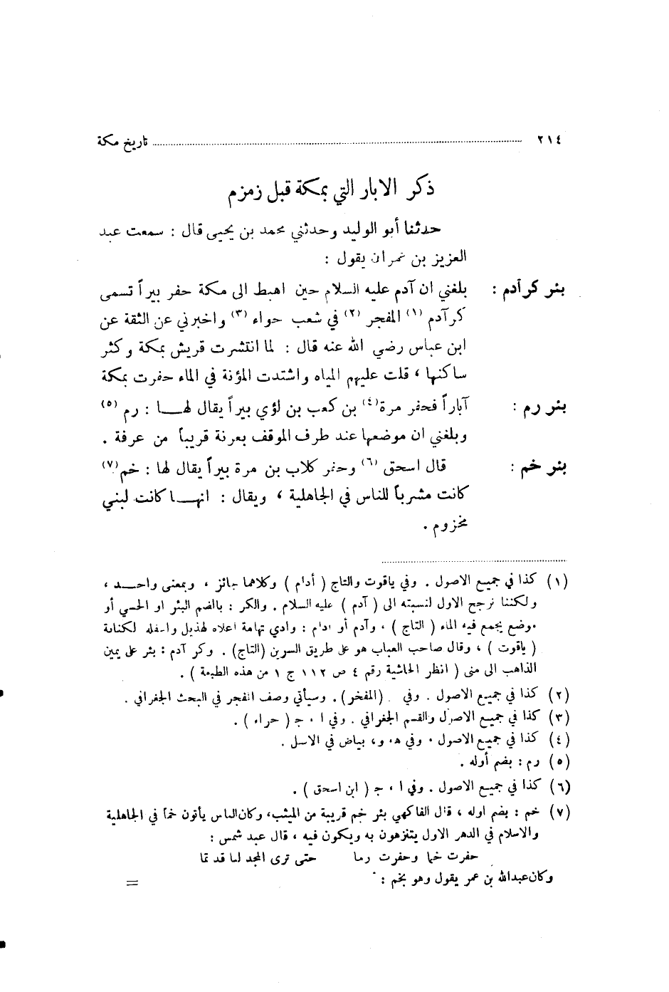 حَدَّثَنَا أَبُو الْوَلِيدِ، قَالَ: وَحَدَّثَنِي مُحَمَّدُ بْنُ يَحْيَى، قَالَ: سَمِعْتُ عَبْدَ الْعَزِيزِ بْنَ عِمْرَانَ، يَقُولُ: بَلَغَنِي أَنَّ آدَمَ عَلَيْهِ السَّلَامُ حِينَ أُهْبِطَ إِلَى مَكَّةَ §حَفَرَ بِئْرًا تُسَمَّى كَرْآدَمَ الْمُفَجَّرَ فِي شِعْبِ حَوَّاءَ