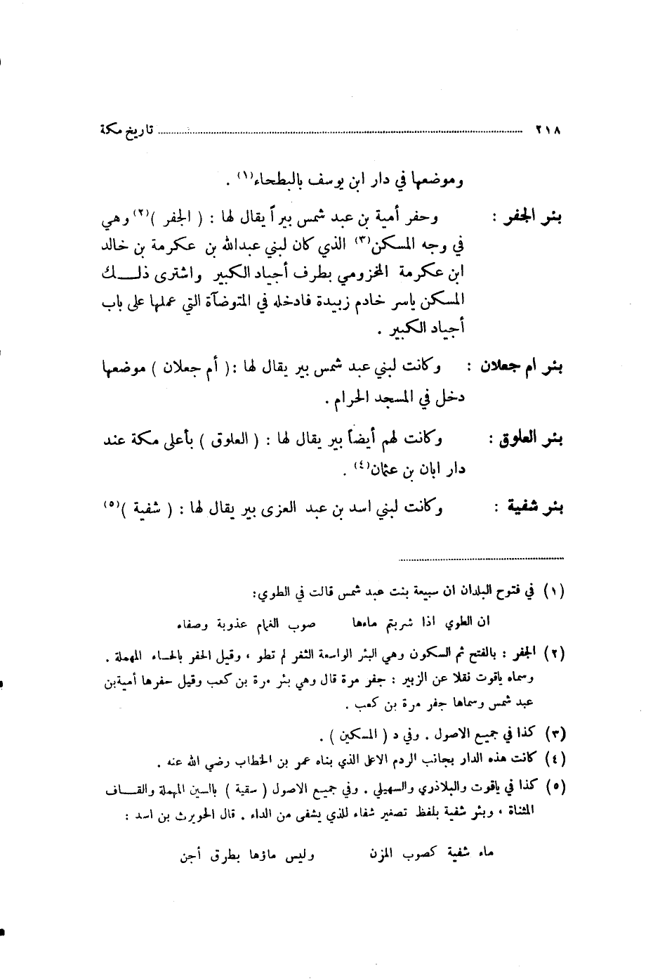 ، وَمَوْضِعُهَا فِي دَارِ ابْنِ يُوسُفَ بِالْبَطْحَاءِ وَحَفَرَ أُمَيَّةُ بْنُ عَبْدِ شَمْسٍ بِئْرًا يُقَالُ لَهَا الْجَفْرُ، وَهِيَ فِي وَجْهِ الْمَسْكَنِ الَّذِي كَانَ لِبَنِي عَبْدِ اللَّهِ بْنِ عِكْرِمَةَ بْنِ خَالِدِ بْنِ عِكْرِمَةَ الْمَخْزُومِيِّ بِطَرَفِ أَجْيَادٍ الْكَبِيرِ، وَاشْتَرَى ذَلِكَ الْمَسْكَنَ يَاسِرٌ خَادِمُ زُبَيْدَةَ، فَأَدْخَلَهُ فِي الْمُتَوَضَّأَةِ الَّتِي عَمِلَهَا عَلَى بَابِ أَجْيَادٍ الْكَبِيرِ وَكَانَتْ لِبَنِي عَبْدِ شَمْسٍ بِئْرٌ يُقَالُ لَهَا أُمُّ جِعْلَانٍ، مَوْضِعُهَا دَخَلَ فِي الْمَسْجِدِ الْحَرَامِ وَكَانَتْ لَهُمْ أَيْضًا بِئْرٌ يُقَالُ لَهَا الْعَلُوقُ بِأَعْلَى مَكَّةَ عِنْدَ دَارِ أَبَانَ بْنِ عُثْمَانَ وَكَانَتْ لِبَنِي أَسَدِ بْنِ عَبْدِ الْعُزَّى بِئْرٌ يُقَالُ لَهَا شُفَيَّةُ