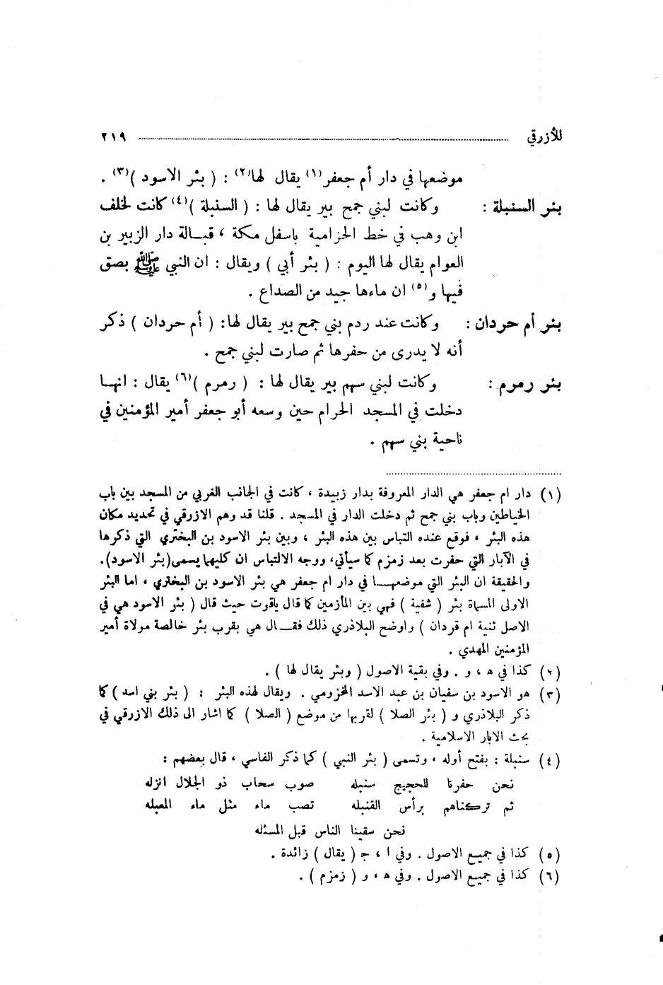 ، مَوْضِعُهَا فِي دَارِ أُمِّ جَعْفَرٍ، يُقَالُ لَهَا بِئْرُ الْأَسْوَدِ وَكَانَتْ لِبَنِي جُمَحٍ بِئْرٌ يُقَالُ لَهَا السَّنْبَلَةُ، كَانَتْ لِخَلَفِ بْنِ وَهْبٍ، فِي خَطِّ الْحِزَامِيَّةِ بِأَسْفَلِ مَكَّةَ، قُبَالَةَ دَارِ الزُّبَيْرِ بْنِ الْعَوَّامِ، يُقَالُ لَهَا الْيَوْمَ بِئْرُ أُبَيٍّ، وَيُقَالُ إِنَّ النَّبِيَّ صَلَّى اللهُ عَلَيْهِ وَسَلَّمَ بَصَقَ فِيهَا، وَإِنَّ مَاءَهَا جَيِّدٌ مِنَ الصُّدَاعِ وَكَانَتْ عِنْدَ رَدْمِ بَنِي جُمَحٍ بِئْرٌ يُقَالُ لَهَا: أُمُّ حَرْدَانَ، ذُكِرَ أَنَّهُ لَا يُدْرَى مَنْ حَفَرَهَا، ثُمَّ صَارَتْ لِبَنِي جُمَحٍ وَكَانَتْ لِبَنِي سَهْمٍ بِئْرٌ يُقَالُ لَهَا رَمْرَمُ، يُقَالُ: إِنَّهَا دَخَلَتْ فِي الْمَسْجِدِ الْحَرَامِ حِينَ وَسَّعَهُ أَبُو جَعْفَرٍ أَمِيرُ الْمُؤْمِنِينَ فِي نَاحِيَةِ بَنِي سَهْمٍ وَكَانَتْ لِبَنِي سَهْمٍ أَيْضًا بِئْرٌ يُقَالُ لَهَا الْغَمْرُ، لَمْ يُذْكَرْ مَوْضِعُهَا وَقَدْ سَمِعْنَا فِي الْبِيَارِ حَدِيثًا جَامِعًا