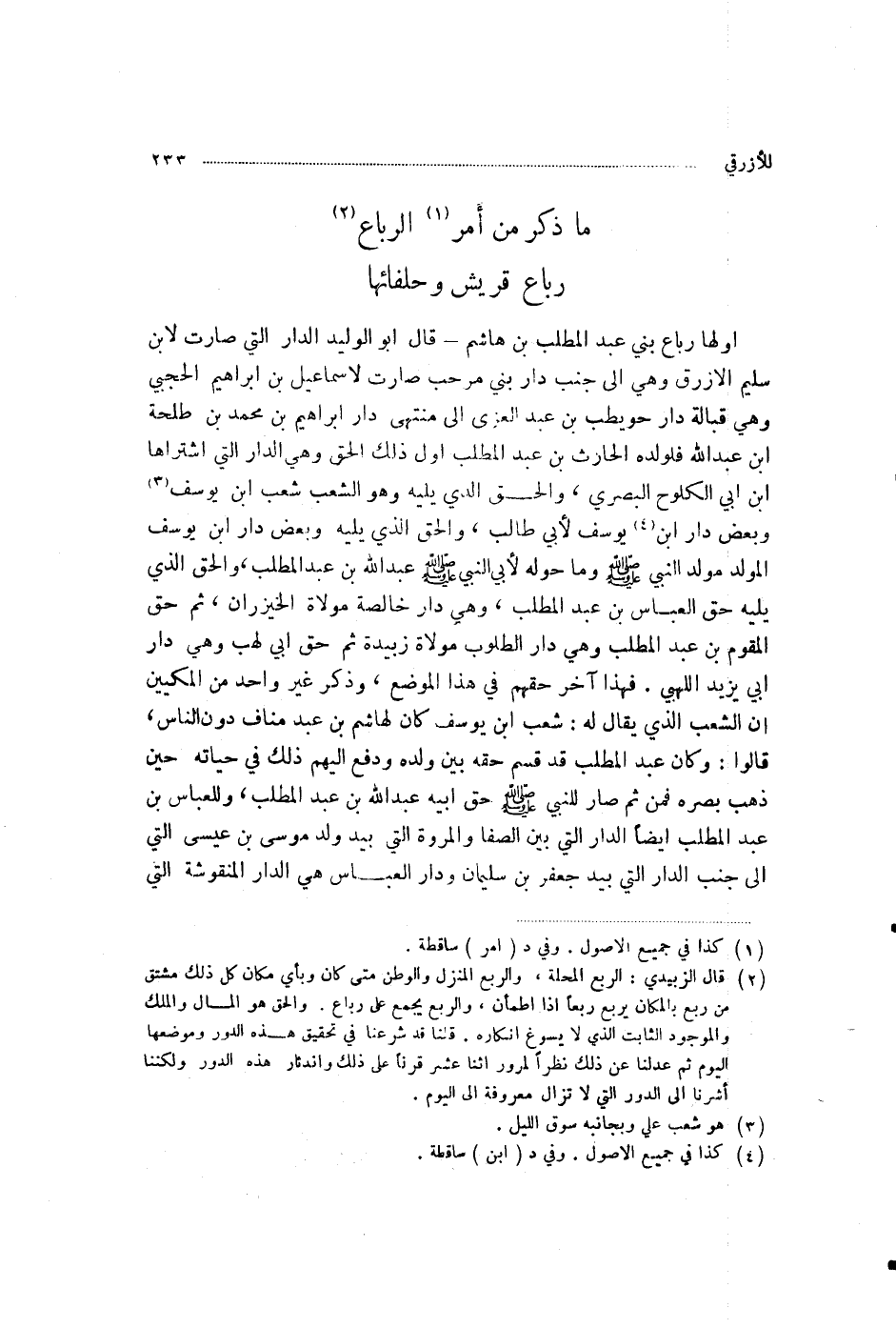 §أَوَّلُهَا رِبَاعُ بَنِي عَبْدِ الْمُطَّلِبِ بْنِ هَاشِمٍ قَالَ أَبُو الْوَلِيدِ: الدَّارُ الَّتِي صَارَتْ لِابْنِ سُلَيْمٍ الْأَزْرَقِ، وَهِيَ إِلَى جَنْبِ دَارِ بَنِي مَرْحَبٍ، صَارَتْ لِإِسْمَاعِيلَ بْنِ إِبْرَاهِيمَ الْحَجَبِيِّ، وَهِيَ قُبَالَةَ دَارِ حُوَيْطِبِ بْنِ عَبْدِ الْعُزَّى إِلَى مُنْتَهَى دَارِ إِبْرَاهِيمَ بْنِ مُحَمَّدِ بْنِ طَلْحَةَ بْنِ عَبْدِ اللَّهِ، فَلِوَلَدِهِ الْحَارِثِ بْنِ عَبْدِ الْمُطَّلِبِ أَوَّلُ ذَلِكَ الْحَقِّ، وَهِيَ الدَّارُ الَّتِي اشْتَرَاهَا ابْنُ أَبِي الْكُلُوحِ الْبَصْرِيُّ، وَالْحَقُّ الَّذِي يَلِيهِ، وَهُوَ الشِّعْبُ شِعْبُ ابْنِ يُوسُفَ، وَبَعْضُ دَارِ ابْنِ يُوسُفَ لِأَبِي طَالِبٍ، وَالْحَقُّ الَّذِي يَلِيهِ، وَبَعْضُ دَارِ ابْنِ يُوسُفَ الْمَوْلِدِ مَوْلِدِ النَّبِيِّ صَلَّى اللهُ عَلَيْهِ وَسَلَّمَ، وَمَا حَوْلَهُ لِأَبِي النَّبِيِّ صَلَّى اللهُ عَلَيْهِ وَسَلَّمَ عَبْدِ اللَّهِ بْنِ عَبْدِ الْمُطَّلِبِ، وَالْحَقُّ الَّذِي يَلِيهِ حَقُّ الْعَبَّاسِ بْنِ عَبْدِ الْمُطَّلِبِ، وَهِيَ دَارُ خَالِصَةَ مَوْلَاةِ الْخَيْزُرَانِ، ثُمَّ حَقُّ الْمُقَوِّمِ بْنِ عَبْدِ الْمُطَّلِبِ، وَهِيَ دَارُ الطَّلُوبِ مَوْلَاةِ زُبَيْدَةَ، ثُمَّ حَقُّ أَبِي لَهَبٍ، وَهِيَ دَارُ أَبِي يَزِيدَ اللِّهْبِيِّ فَهَذَا آخِرُ حَقِّهِمْ فِي هَذَا الْمَوْضِعِ، وَذَكَرَ غَيْرُ وَاحِدٍ مِنَ الْمَكِّيِّينَ أَنَّ الشِّعْبَ الَّذِي يُقَالُ لَهُ شِعْبُ ابْنِ يُوسُفَ كَانَ لِهَاشِمِ بْنِ عَبْدِ مَنَافٍ دُونَ النَّاسِ قَالُوا: وَكَانَ عَبْدُ الْمُطَّلِبِ قَدْ قَسَمَ حَقَّهُ بَيْنَ وَلَدِهِ، وَدَفَعَ إِلَيْهِمْ ذَلِكَ فِي حَيَاتِهِ حِينَ ذَهَبَ بَصَرُهُ، فَمِنْ ثَمَّ صَارَ لِلنَّبِيِّ صَلَّى اللهُ عَلَيْهِ وَسَلَّمَ حَقُّ أَبِيهِ عَبْدِ اللَّهِ بْنِ عَبْدِ الْمُطَّلِبِ، وَلِلْعَبَّاسِ بْنِ عَبْدِ الْمُطَّلِبِ أَيْضًا الدَّارُ الَّتِي بَيْنَ الصَّفَا وَالْمَرْوَةِ الَّتِي بِيَدِ وَلَدِ مُوسَى بْنِ عِيسَى الَّتِي إِلَى جَنْبِ الدَّارِ الَّتِي بِيَدِ جَعْفَرِ بْنِ سُلَيْمَانَ، وَدَارُ الْعَبَّاسِ هِيَ الدَّارُ الْمَنْقُوشَةُ الَّتِي