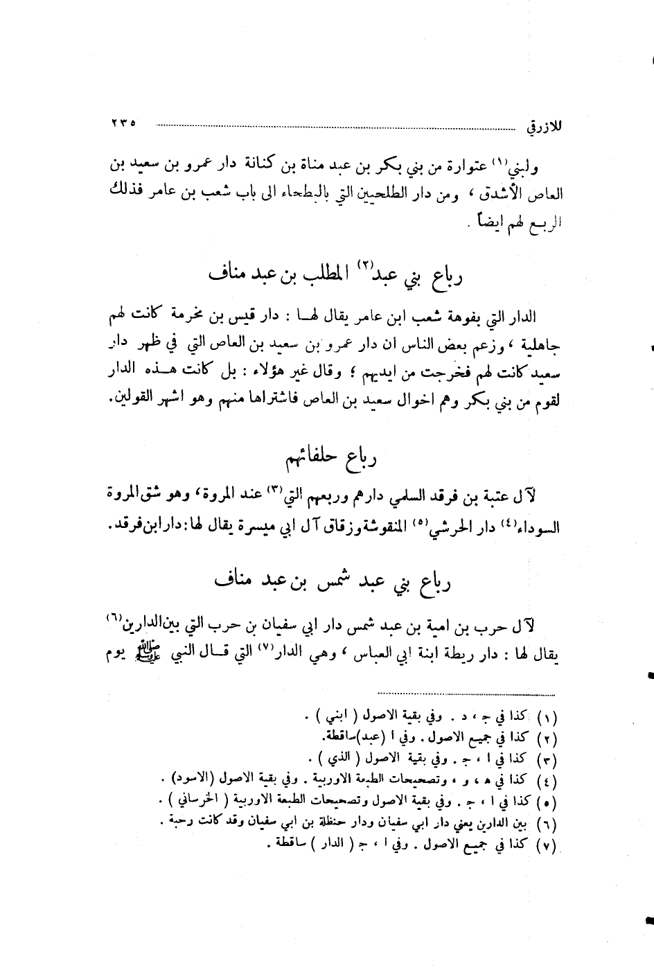 §رِبَاعُ بَنِي عَبْدِ الْمُطَّلِبِ بْنِ عَبْدِ مَنَافٍ الدَّارُ الَّتِي بِفُوَّهَةِ شِعْبِ ابْنِ عَامِرٍ يُقَالُ لَهَا دَارُ قَيْسِ بْنِ مَخْرَمَةَ، كَانَتْ لَهُمْ جَاهِلِيَّةً، وَزَعَمَ بَعْضُ النَّاسِ أَنَّ دَارَ عَمْرِو بْنِ سَعِيدِ بْنِ الْعَاصِ الَّتِي فِي ظَهْرِ دَارِ سَعِيدٍ كَانَتْ لَهُمْ، فَخَرَجَتْ مِنْ أَيْدِيهِمْ وَقَالَ غَيْرُ هَؤُلَاءِ: بَلْ كَانَتْ هَذِهِ الدَّارُ لِقَوْمٍ مِنْ بَنِي بَكْرٍ، وَهُمْ أَخْوَالُ سَعِيدِ بْنِ الْعَاصِ، فَاشْتَرَاهَا مِنْهُمْ وَهُوَ أَشْهُرُ الْقَوْلَيْنِ