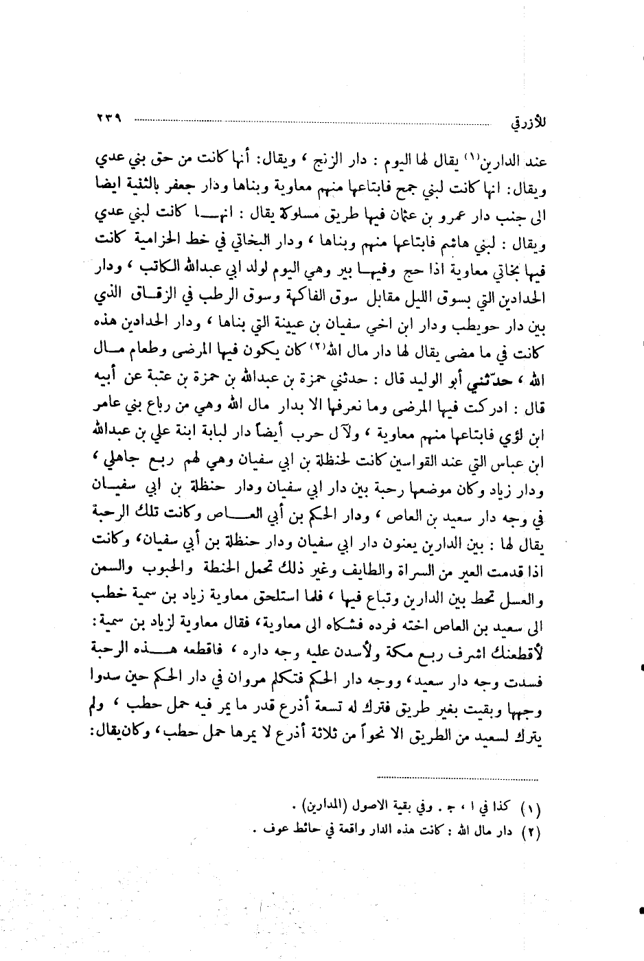 عِنْدَ الدَّارَيْنِ، يُقَالُ لَهَا الْيَوْمَ دَارُ الزِّنْجِ، وَيُقَالُ: أِنَّهَا كَانَتْ مِنْ حَقِّ بَنِي عَدِيٍّ، وَيُقَالُ: إِنَّهَا كَانَتْ لِبَنِي جُمَحٍ، فَابْتَاعَهَا مِنْهُمْ مُعَاوِيَةُ وَبَنَاهَا، وَدَارُ جَعْفَرٍ بِالثَّنِيَّةِ أَيْضًا إِلَى جَنْبِ دَارِ عَمْرِو بْنِ عُثْمَانَ، فِيهَا طَرِيقٌ مَسْلُوكَةٌ، يُقَالُ: إِنَّهَا كَانَتْ لِبَنِي عَدِيٍّ، وَيُقَالُ: لِبَنِي هَاشِمٍ، فَابْتَاعَهَا مِنْهُمْ وَبَنَاهَا، وَدَارُ الْبَخَاتِيِّ فِي خَطِّ الْحِزَامِيَّةِ، كَانَتْ فِيهَا بَخَاتِيُّ مُعَاوِيَةَ إِذَا حَجَّ، وَفِيهَا بِئْرٌ، وَهِيَ الْيَوْمَ لِوَلَدِ أَبِي عَبْدِ اللَّهِ الْكَاتِبِ، وَدَارُ الْحَدَّادِينَ الَّتِي بِسُوقِ اللَّيْلِ مُقَابِلَ سُوقِ الْفَاكِهَةِ وَسُوقِ الرُّطَبِ فِي الزُّقَاقِ الَّذِي بَيْنَ دَارِ حُوَيْطِبٍ، وَدَارِ ابْنِ أَخِي سُفْيَانَ بْنِ عُيَيْنَةَ الَّتِي بَنَاهَا، وَدَارُ الْحَدَّادِينَ هَذِهِ كَانَتْ فِي مَا مَضَى يُقَالُ لَهَا دَارُ مَالِ اللَّهِ، كَانَ يَكُونُ فِيهَا الْمَرْضَى، وَطَعَامُ مَالِ اللَّهِ. حَدَّثَنِي أَبُو الْوَلِيدِ قَالَ: حَدَّثَنِي حَمْزَةُ بْنُ عَبْدِ اللَّهِ بْنِ حَمْزَةَ بْنِ عُتْبَةَ، عَنْ أَبِيهِ قَالَ: أَدْرَكْتُ فِيهَا الْمَرْضَى، وَمَا نَعْرِفُهَا إِلَّا بِدَارِ مَالِ اللَّهِ، وَهِيَ مِنْ رِبَاعِ بَنِي عَامِرِ بْنِ لُؤَيٍّ، فَابْتَاعَهَا مِنْهُمْ مُعَاوِيَةُ، وَلِآلِ حَرْبٍ أَيْضًا دَارُ لُبَابَةَ ابْنَةِ عَلِيِّ بْنِ عَبْدِ اللَّهِ بْنِ عَبَّاسٍ الَّتِي عِنْدَ الْقَوَّاسِينَ، كَانَتْ لِحَنْظَلَةَ بْنِ أَبِي سُفْيَانَ، وَهِيَ لَهُمْ رَبْعٌ جَاهِلِيٌّ، وَدَارُ زِيَادٍ، وَكَانَ مَوْضِعُهَا رَحَبَةً بَيْنَ دَارِ أَبِي سُفْيَانَ، وَدَارِ حَنْظَلَةَ بْنِ أَبِي سُفْيَانَ فِي وَجْهِ دَارِ سَعِيدِ بْنِ الْعَاصِ، وَدَارِ الْحَكَمِ بْنِ أَبِي الْعَاصِ، وَكَانَتْ تِلْكَ الرَّحَبَةُ يُقَالُ لَهَا بَيْنَ الدَّارَيْنِ، يَعْنُونَ دَارَ أَبِي سُفْيَانَ، وَدَارَ حَنْظَلَةَ بْنِ أَبِي سُفْيَانَ، وَكَانَتْ إِذَا قَدِمَتِ الْعِيرُ مِنَ السَّرَاةِ وَالطَّائِفِ وَغَيْرِ ذَلِكَ تَحْمِلُ الْحِنْطَةَ وَالْحُبُوبَ وَالسَّمْنَ وَالْعَسَلَ، تَحُطُّ بَيْنَ الدَّارَيْنِ، وَتُبَاعُ فِيهَا، فَلَمَّا اسْتَلْحَقَ مُعَاوِيَةُ زِيَادَ بْنَ سُمَيَّةَ خَطَبَ إِلَى سَعِيدِ بْنِ الْعَاصِ أُخْتَهُ فَرَدَّهُ، فَشَكَاهُ إِلَى مُعَاوِيَةَ، فَقَالَ مُعَاوِيَةُ لِزِيَادِ بْنِ سُمَيَّةَ: لُأَقْطِعَنَّكَ أَشْرَفَ رَبْعِ مَكَّةَ، وَلَأَسُدَنَّ عَلَيْهِ وَجْهَ دَارِهِ فَأَقْطَعَهُ هَذِهِ الرَّحَبَةَ، فَسَدَّتْ وَجْهَ دَارِ سَعِيدٍ، وَوَجْهَ دَارِ الْحَكَمِ، فَتَكَلَّمَ مَرْوَانُ فِي دَارِ الْحَكَمِ حِينَ سَدُّوا وَجْهَهَا وَبَقِيَتْ بِغَيْرِ طَرِيقٍ، فَتَرَكَ لَهُ تِسْعَةَ أَذْرُعٍ قَدْرَ مَا يَمُرُّ فِيهِ حِمْلُ حَطَبٍ، وَلَمْ يَتْرُكْ لِسَعِيدٍ مِنَ الطَّرِيقِ إِلَّا نَحْوًا مِنْ ثَلَاثَةِ أَذْرُعٍ لَا يَمُرُّهَا حِمْلُ حَطَبٍ، وَكَانَ يُقَالُ