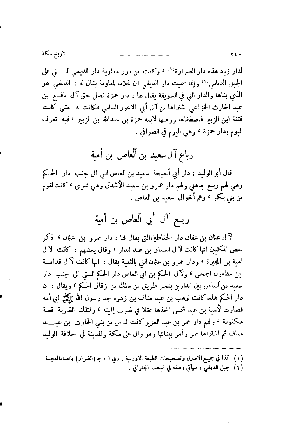 §رَبْعُ آلِ أَبِي الْعَاصِ بْنِ أُمَيَّةَ لِآلِ عُثْمَانَ بْنِ عَفَّانَ دَارُ الْحَنَّاطِينَ الَّتِي يُقَالُ لَهَا دَارُ عَمْرِو بْنِ عُثْمَانَ، ذَكَرَ بَعْضُ الْمَكِّيِّينَ أَنَّهَا كَانَتْ لِآلِ السَّبَّاقِ بْنِ عَبْدِ الدَّارِ، وَقَالَ بَعْضُهُمْ: كَانَتْ لِآلِ أُمَيَّةَ بْنِ الْمُغِيرَةِ، وَدَارُ عَمْرِو بْنِ عُثْمَانَ الَّتِي بِالثَّنِيَّةِ يُقَالُ: إِنَّهَا كَانَتْ لِآلِ قُدَامَةَ بْنِ مَظْعُونٍ الْجُمَحِيِّ، وَلِآلِ الْحَكَمِ بْنِ أَبِي الْعَاصِ دَارُ الْحَكَمِ الَّتِي إِلَى جَنْبِ دَارِ سَعِيدِ بْنِ الْعَاصِ بَيْنَ الدَّارَيْنِ بِنَحْرِ طَرِيقِ مَنْ سَلَكَ مِنْ زُقَاقِ الْحَكَمِ، وَيُقَالُ: إِنَّ دَارَ الْحَكَمِ هَذِهِ كَانَتْ لِوَهْبِ بْنِ عَبْدِ مَنَافِ بْنِ زُهْرَةَ جَدِّ رَسُولِ اللَّهِ صَلَّى اللهُ عَلَيْهِ وَسَلَّمَ أَبِي أُمِّهِ، فَصَارَتْ لِأُمَيَّةَ بْنِ عَبْدِ شَمْسٍ، أَخَذَهَا عَقْلًا فِي ضَرْبِ أَلْيَتِهِ، وَلِتِلْكَ الضَّرْبَةِ قِصَّةٌ مَكْتُوبَةٌ، وَلَهُمْ دَارُ عُمَرَ بْنِ عَبْدِ الْعَزِيزِ، كَانَتْ لِنَاسٍ مِنْ بَنِي الْحَارِثِ بْنِ عَبْدِ مَنَافٍ، ثُمَّ اشْتَرَاهَا عُمَرُ، وَأَمَرَ بِبِنَائِهَا، وَهُوَ وَالٍ عَلَى مَكَّةَ وَالْمَدِينَةِ فِي خِلَافَةِ الْوَلِيدِ