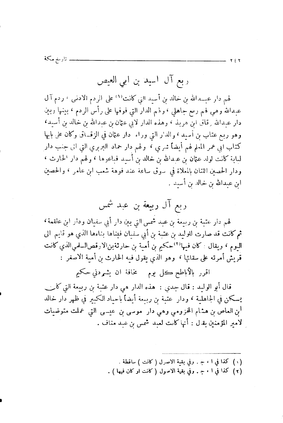 §رَبْعُ آلِ أَسِيدِ بْنِ أَبِي الْعِيصِ لَهُمْ دَارُ عَبْدِ اللَّهِ بْنِ خَالِدِ بْنِ أَسِيدٍ الَّتِي كَانَتْ عَلَى الرَّدْمِ الْأَدْنَى، رَدْمِ آلِ عَبْدِ اللَّهِ، وَهِيَ لَهُمْ رَبْعٌ جَاهِلِيٌّ، وَلَهُمُ الدَّارُ الَّتِي فَوْقَهَا عَلَى رَأْسِ الرَّدْمِ، بَيْنَهَا وَبَيْنَ دَارِ عَبْدِ اللَّهِ زُقَاقُ ابْنِ هَرْبَذٍ، وَهَذِهِ الدَّارُ لِأَبِي عُثْمَانَ بْنِ عَبْدِ اللَّهِ بْنِ خَالِدِ بْنِ أَسِيدٍ، وَهُوَ رَبْعُ عَتَّابِ بْنِ أَسِيدٍ، وَالدَّارُ الَّتِي وَرَاءَ دَارِ عُثْمَانَ فِي الزُّقَاقِ، كَانَ عَلَى بَابِهَا كِتَابُ أَبِي عُمَرَ الْمُعَلِّمِ لَهُمْ أَيْضًا شِرًى، وَلَهُمْ دَارُ حَمَّادٍ الْبَرْبَرِيِّ الَّتِي إِلَى جَنْبِ دَارِ لُبَابَةَ، كَانَتْ لِوَلَدِ عُثْمَانَ بْنِ عَبْدِ اللَّهِ بْنِ خَالِدِ بْنِ أَسِيدٍ فَبَاعُوهَا، وَلَهُمْ دَارُ الْحَارِثِ، وَدَارُ الْحُصَيْنِ اللَّتَانِ بِالْمَعْلَاةِ فِي سُوقِ سَاعَةَ عِنْدَ فُوَّهَةِ شِعْبِ ابْنِ عَامِرٍ، وَالْحُصَيْنِ بْنِ عَبْدِ اللَّهِ بْنِ خَالِدِ بْنِ أَسِيدٍ