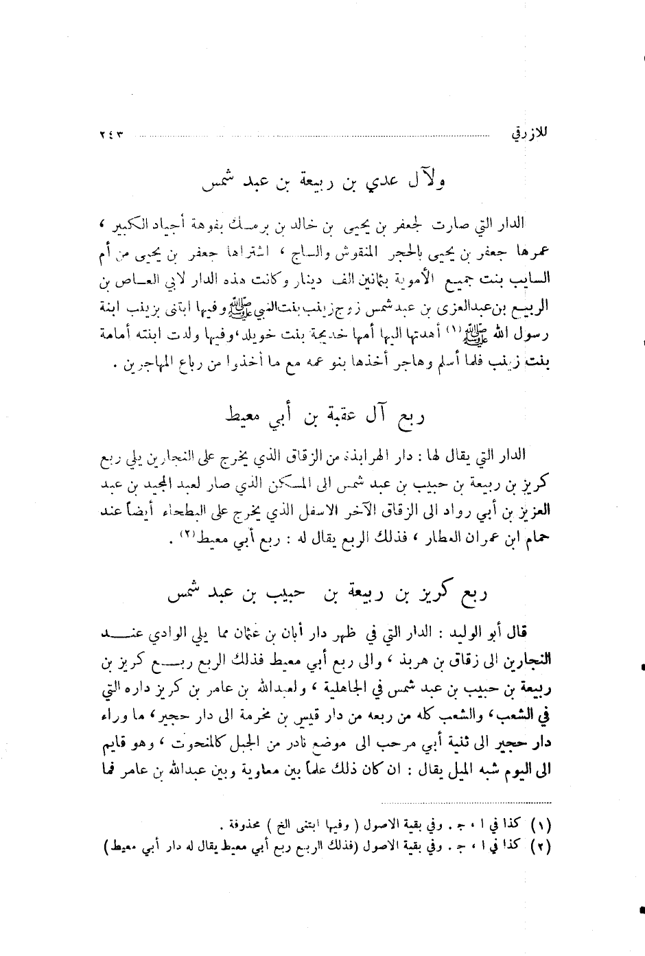 §وَلِآلِ عَدِيِّ بْنِ رَبِيعَةَ بْنِ عَبْدِ شَمْسٍ الدَّارُ الَّتِي صَارَتْ لِجَعْفَرِ بْنِ يَحْيَى بْنِ خَالِدِ بْنِ بَرْمَكَ بِفُوَّهَةِ أَجْيَادٍ الْكَبِيرِ، عَمَّرَهَا جَعْفَرُ بْنُ يَحْيَى بِالْحَجَرِ الْمَنْقُوشِ وَالسَّاجِ، اشْتَرَاهَا جَعْفَرُ بْنُ يَحْيَى مِنْ أُمِّ السَّائِبِ بِنْتِ جُمَيْعٍ الْأُمَوِيَّةِ بِثَمَانِينَ أَلْفَ دِينَارٍ، وَكَانَتْ هَذِهِ الدَّارُ لِأَبِي الْعَاصِ بْنِ الرَّبِيعِ بْنِ عَبْدِ الْعُزَّى بْنِ عَبْدِ شَمْسٍ زَوْجِ زَيْنَبَ بِنْتِ رَسُولِ اللَّهِ صَلَّى اللهُ عَلَيْهِ وَسَلَّمَ، وَفِيهَا ابْتَنَى بِزَيْنَبَ ابْنَةِ رَسُولِ اللَّهِ صَلَّى اللهُ عَلَيْهِ وَسَلَّمَ، أَهْدَتْهَا إِلَيْهَا أُمُّهَا خَدِيجَةُ بِنْتُ خُوَيْلِدٍ، وَفِيهَا وُلِدَتِ ابْنَتُهُ أُمَامَةُ بِنْتُ زَيْنَبَ، فَلَمَّا أَسْلَمَ وَهَاجَرَ أَخَذَهَا بَنُو عَمِّهِ مَعَ مَا أَخَذُوا مِنْ رِبَاعِ الْمُهَاجِرِينَ